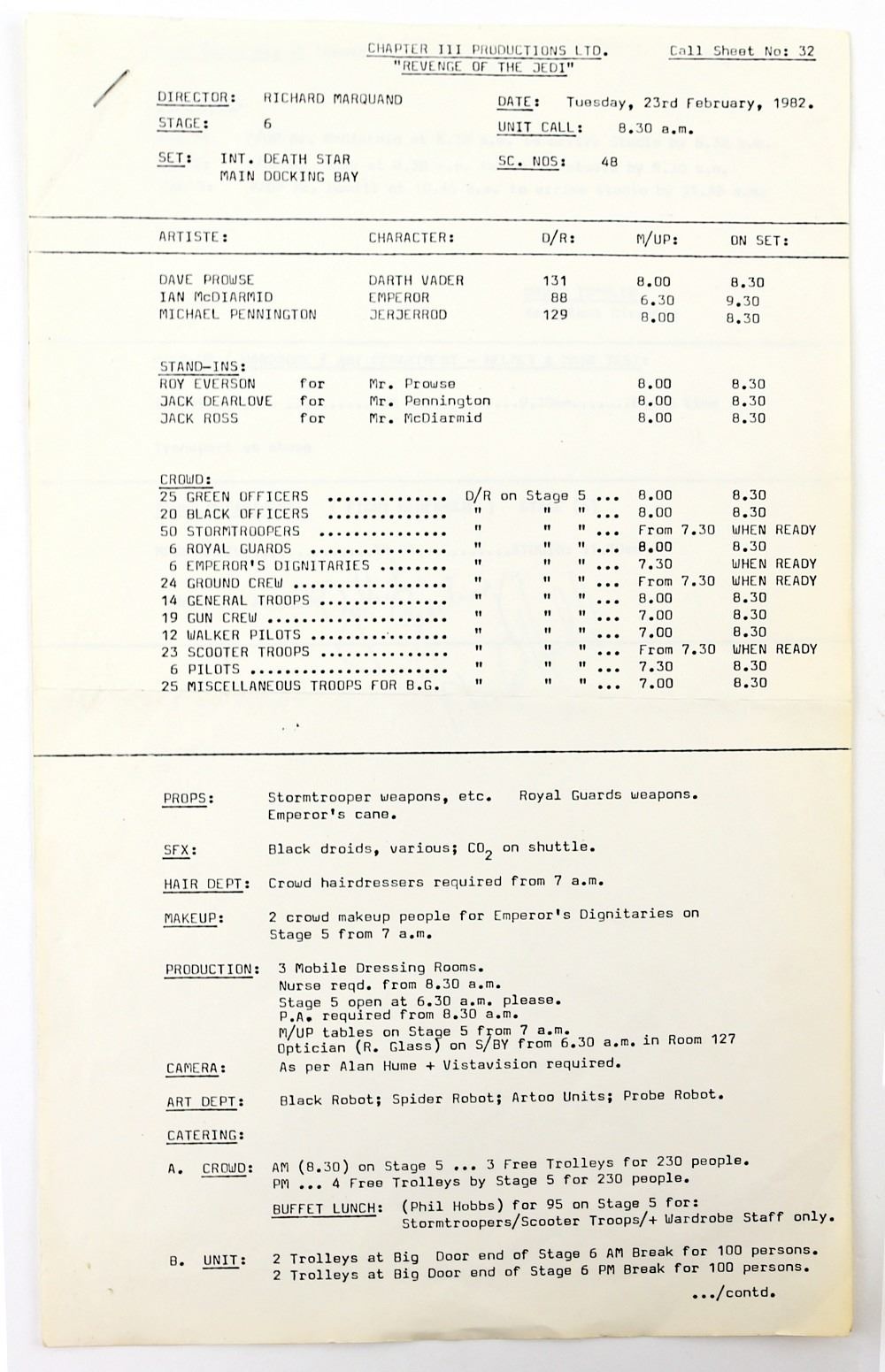 Star Wars Return of The Jedi (1983) - Revenge of The Jedi call Sheet from Tuesday 23rd February 1982
