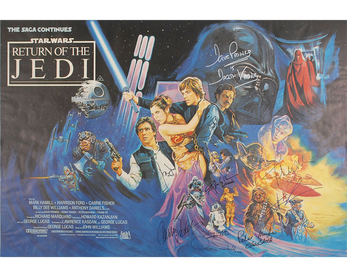 Color 40 x 27 British ‘quad’ poster for Return of the Jedi, signed in ink and felt tip by 10 including: Mark Hamill, Harrison Ford, Carrie Fisher, David Prowse, Billy Dee Williams, Anthony Daniels, Kenny Baker, Peter Mayhew, John Williams, and George Lucas. In fine condition. The British poster features some rather unique artwork, being one of the few that has the Royal Guards, Boushh, and Boba Fett.