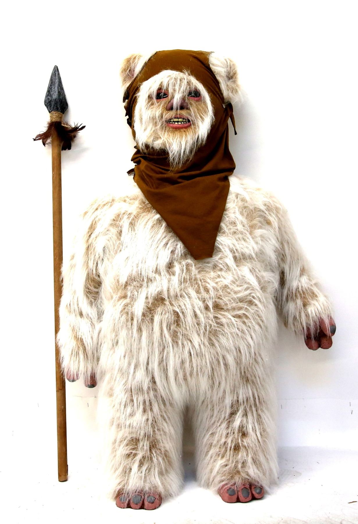 Star Wars Return of the Jedi (1983) - A life size Ewok display prop made from solid foam and rubber latex with hand-painted features, plastic eyes and realistic long beige fur. Stands approximately 100cm tall with posable arms, a removable cowl and a replica spear.