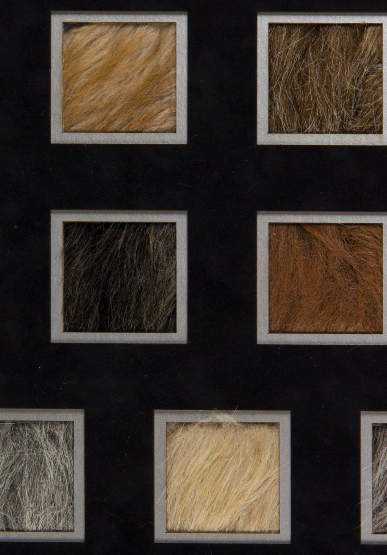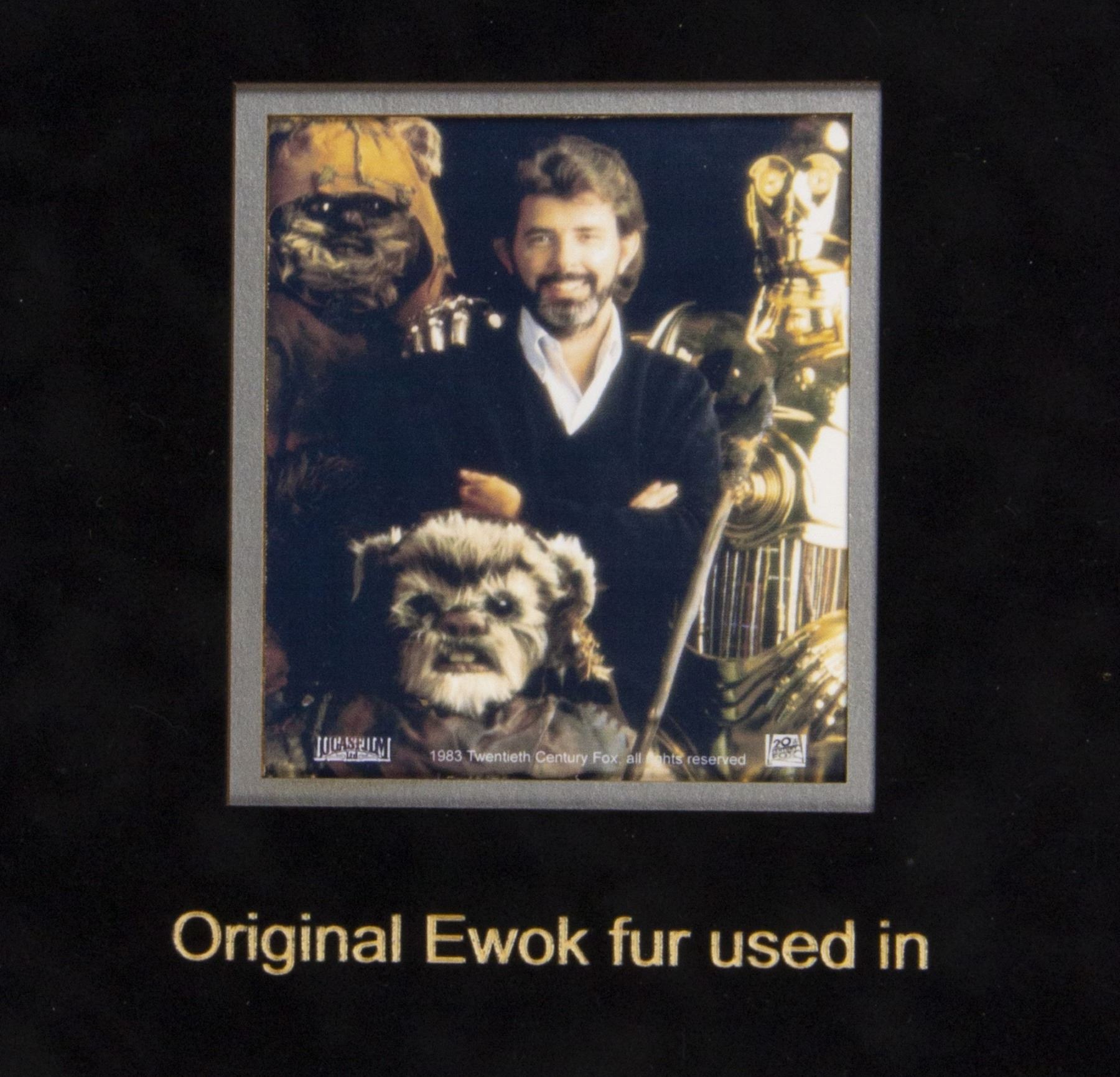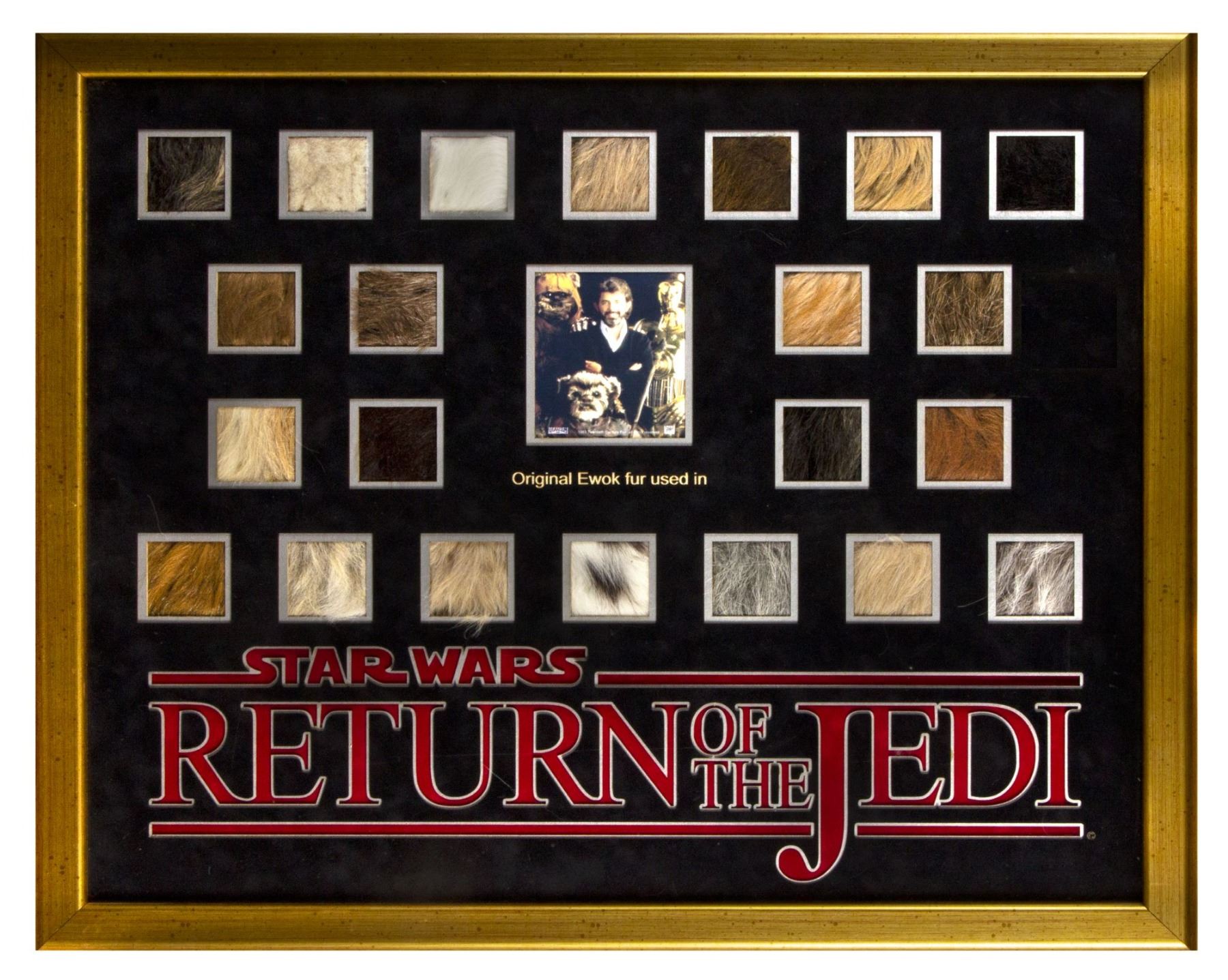 (20th Century Fox, 1983) A framed set of original Ewok fur pieces used in the production of "Star Wars: Episode VI - Return of the Jedi". These 22 very rare sections of Ewok fur are off-cuts of the original Ewok costumes, and come from the collection of legendary make-up and effects artist Stuart Freeborn, who helped to create many of the iconic Star Wars characters including Yoda and Chewbacca. Framed with the sections of fur is a photo of George Lucas with his Ewoks, and a large title for the film. Measuring approximately 25"x29" and 1" thick, the framed display is in very good condition with minor wear.