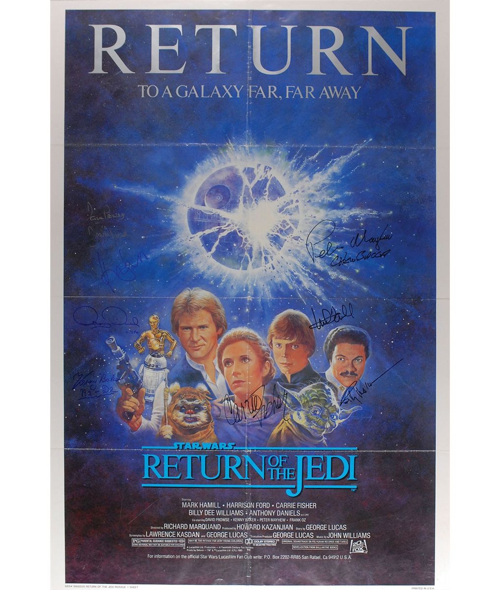 Color 27 x 41 one sheet reissue movie poster for Return of the Jedi, signed in felt tip and ink by Harrison Ford, Mark Hamill, Carrie Fisher, Billy Dee Williams, Anthony Daniels, Kenny Baker, Peter Mayhew, and David Prowse. In fine condition, with intersecting storage folds with a few light separations at intersections and some scattered light creases and edge dings.