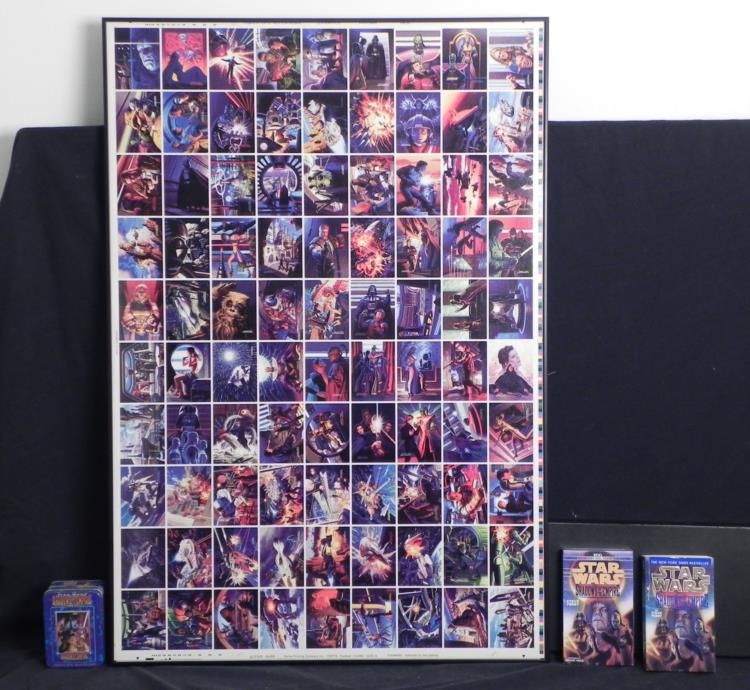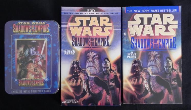 Here are four great collectibles frrom Star Wars Shadow of the Empire. Included are: * * * Full uncut card sheet, with 90 different cards, framed with glass on both sides, with backs fully visible * Set of 6 embossed metal collector cards, mint and sealed in metal box * Paperback book by Steve Perry, from Bantam Spectra * Audio book on two cassettes * It's great to have four different items from this fantastic Star Wars series!