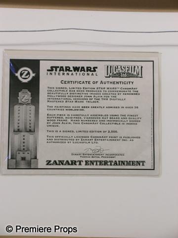 Star Wars International Box Key Art - Features a black metal frame with blue matting and three pictures, including Senator Palpatine, Darth Vador, and Luke Skywalker. This Star Wars Art is signed by the artist 'John Alvin' and is number 264/2500. Includes the original certificate of authenticity on the back. (approx. 31" x 19"). This item is oversized and will require additional shipping charges. Please email for shipping rates prior to bidding.