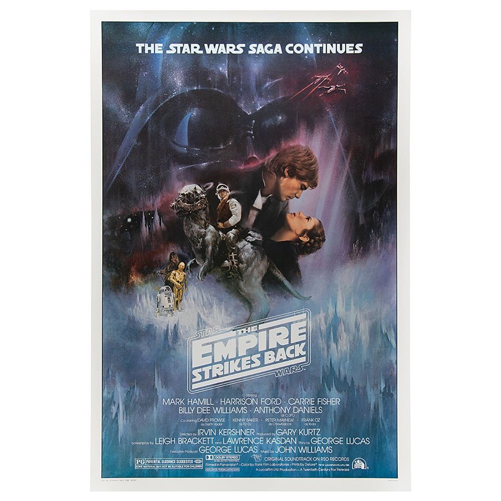 (20th Century Fox, 1980) Original color 27 x 41 studio version 'Style A' one sheet movie poster for the 1980 space opera The Empire Strikes Back, which features Roger Kastel's famous 'Gone With the Wind' style artwork of Hans Solo, Princess Leia, Luke Skywalker on a tauntaun, R2-D2, C-3PO, and Chewbacca below a large image of Darth Vader's upper helmet, with upper text reading: "The Star Wars Saga Continues." Lower portion features cast and crew credits and production details, with the bottom border of this 'studio' variant reading "Empire Strikes Back One Sheet, Printed In USA." Professionally restored to fine condition.