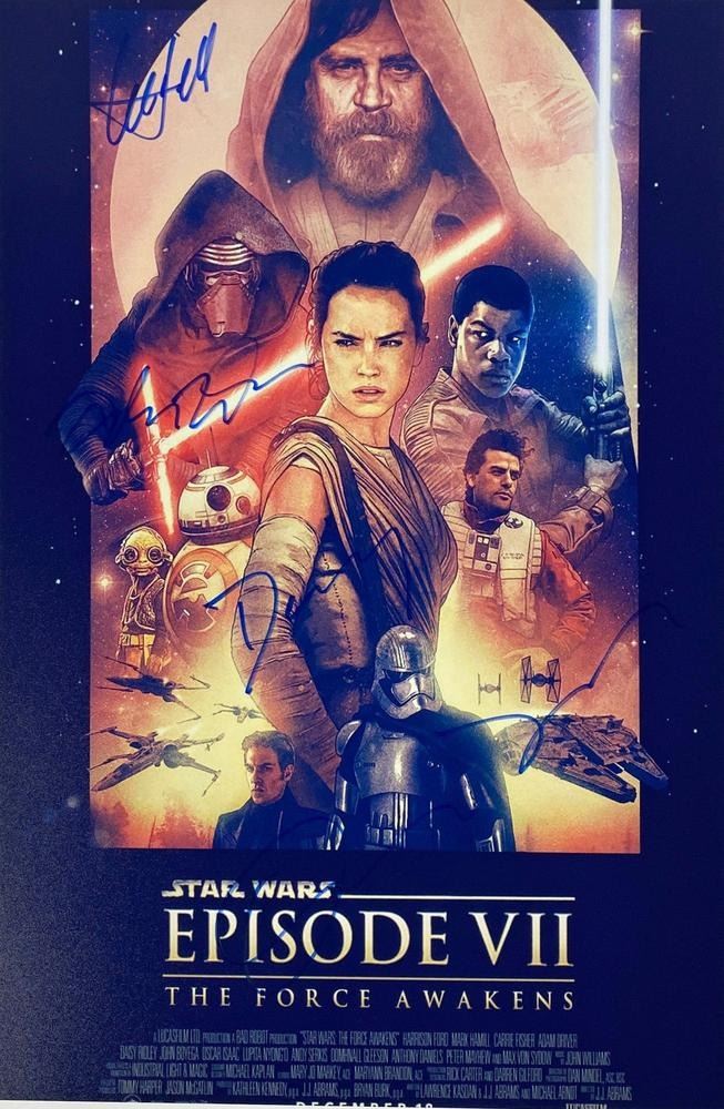 Star Wars: The Force Awakens cast facsimile signed movie photo autographed by Daisy Ridley, Adam Driver, Mark Hamill 8x10 inches. This item is a reprint of an original autograph