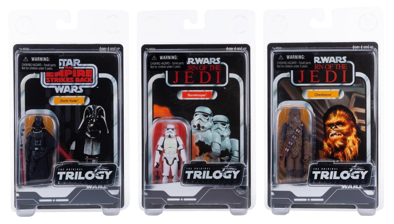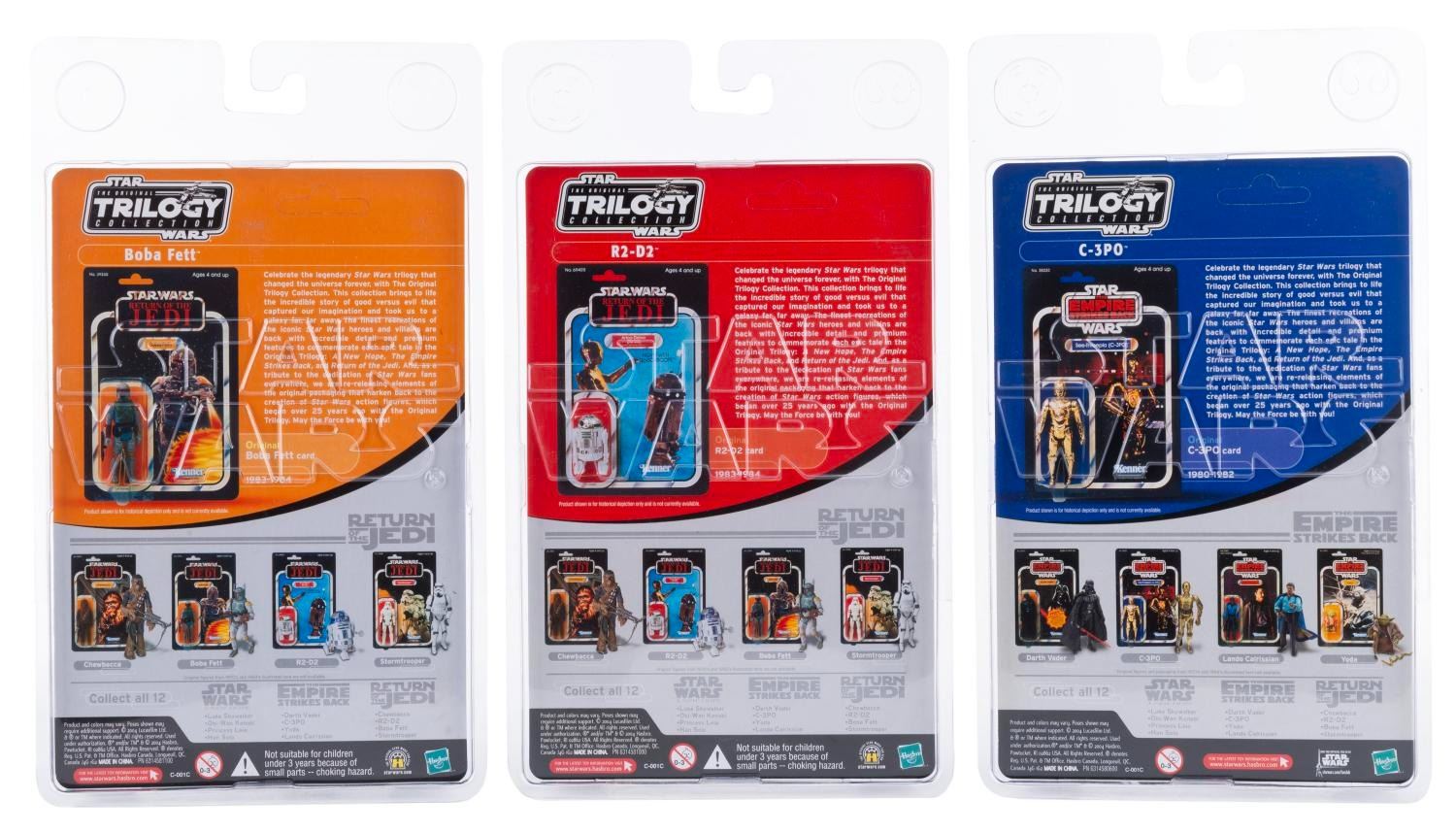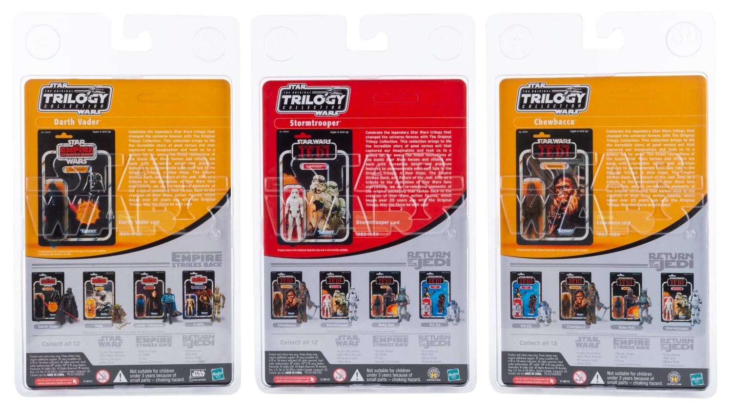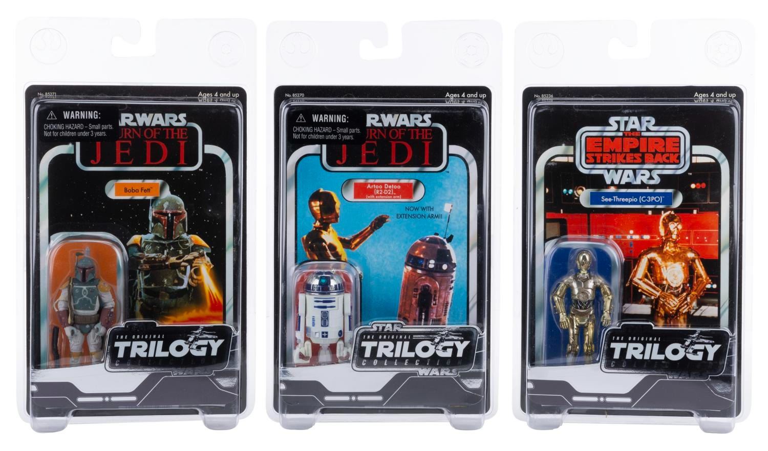 (Hasbro, 2004) A set of six figures from the Star Wars: The Original Trilogy Collection, including Darth Vader, Chewbacca, Boba Fett, R2-D2, C-3PO, and a Stormtrooper. The 3.75” figures are sealed on their 6” x 9” cards, inside 6.5” x 11” x 1.75” deep protective cases. The figures and packaging are in fine condition with light scuffs to the protective cases.
