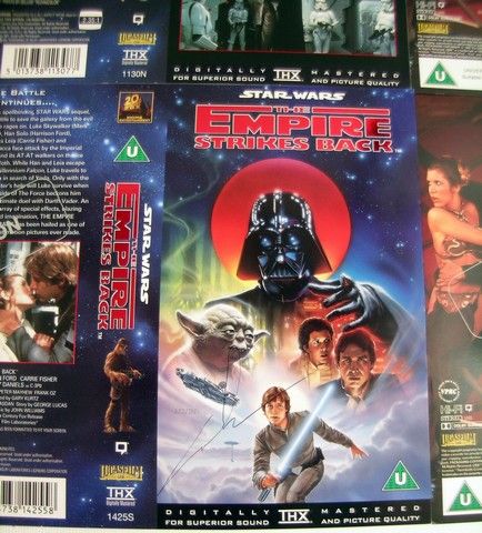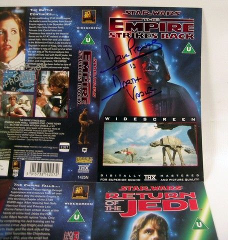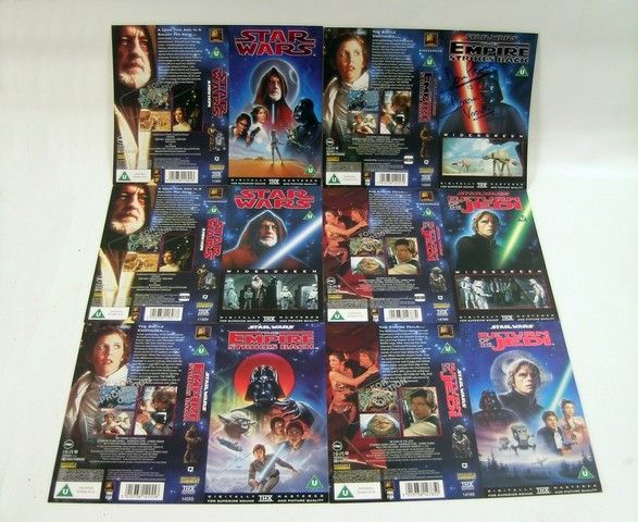 Star Wars set of six UK 1995 video release covers, including "The Empire Strikes Back and "The Return of the Jedi". The first set is for widescreen, and the second set of three are for full screen. The "Empire Strikes Back" covers are signed one by David Prowse (Darth Vader) and the second by George Lucas. All are stamped for promotion only and are quite rare. They were only used in the UK. Please note these are the covers only and do not contain the videos.