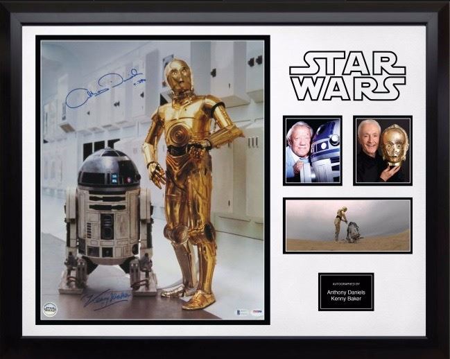 Custom framed Star Wars c3p0 and R2D2 autographed photo and movie collage. Original photo signed by Kenny Baker and Anthony Daniels. Approximate dimensions are 32x26 inches. This item is authenticated by PSA. This item comes with a Certificate of Authenticity from a third party authenticator. This Certification of Authenticity does not imply that the item will be certified by any other rival authentication companies. The accompanied certification is the only certification the auction company can confirm. These items are being sold as collectable pieces and there is no guarantee that this item can be resold on any online marketplace. Each of these companies has their own policies and politics.