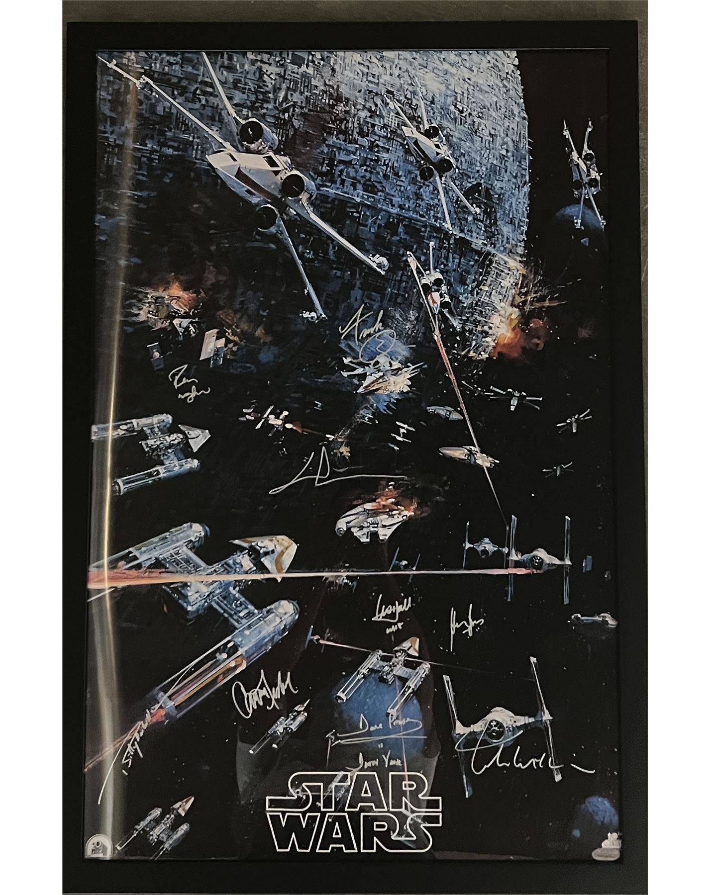 Star Wars cast signed movie poster autographed by Mark Hamill, Carrie Fisher, Harrison Ford, Peter Mayhew, Frank Oz, Billy Dee Williams, Dave Prowse, John Williams and George Lucas. 26x39 inches
