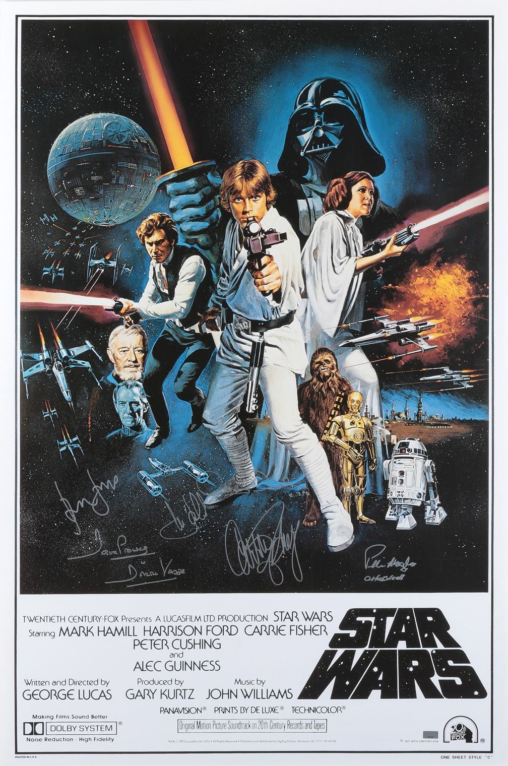 393. Star Wars cast-signed re-release 1-sheet poster.(TCF, 1977) Cast-signed poster for the original Star Wars measuring 27 x 40 in., signed by Harrison Ford, Carrie Fisher, Mark Hamill, David Prowse, Anthony Daniels, and Peter Mayhew. In fine condition. Accompanied by COAs from Celebrity Authentics for all signatures. $7,000 - $9,000