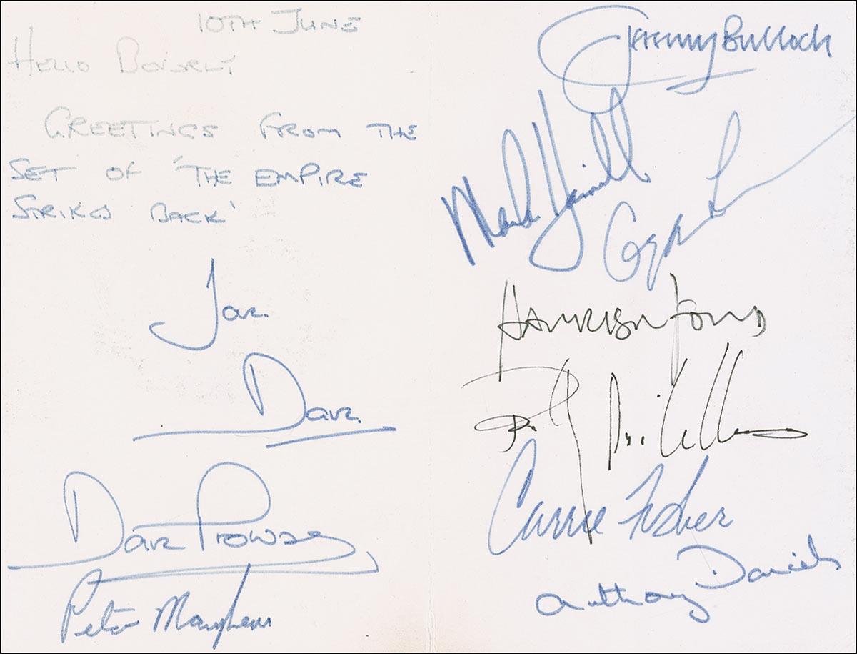 An amazing 4 x 6 greeting card, dated inside June 10, filled out on the left side by David Prowse, “Hello Heverly, Greetings from the set of ‘The Empire Strikes Back, Love Dave,” and signed on the inside left and right panels again by Prowse, as well as Harrison Ford, Mark Hamill, Carrie Fisher, Billy Dee Williams, George Lucas, Peter Mayhew, Jeremy Bullock, and Anthony Daniels. In fine condition, with beginning of Prowse’s message a bit light, but completely legible. A scarce format with all the film’s major cast members.