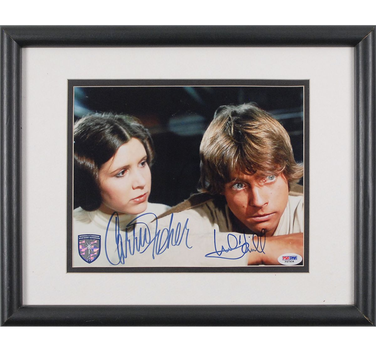 Color satin-finish 9.5 x 7.5 photo of Luke Skywalker and Princess Leia, signed in blue felt tip by Mark Hamill and Carrie Fisher. Double-matted and framed to an overall size of 15.5 x 12.5. In fine condition, with a PSA/DNA label affixed to the lower right (certificate of authenticity not present).