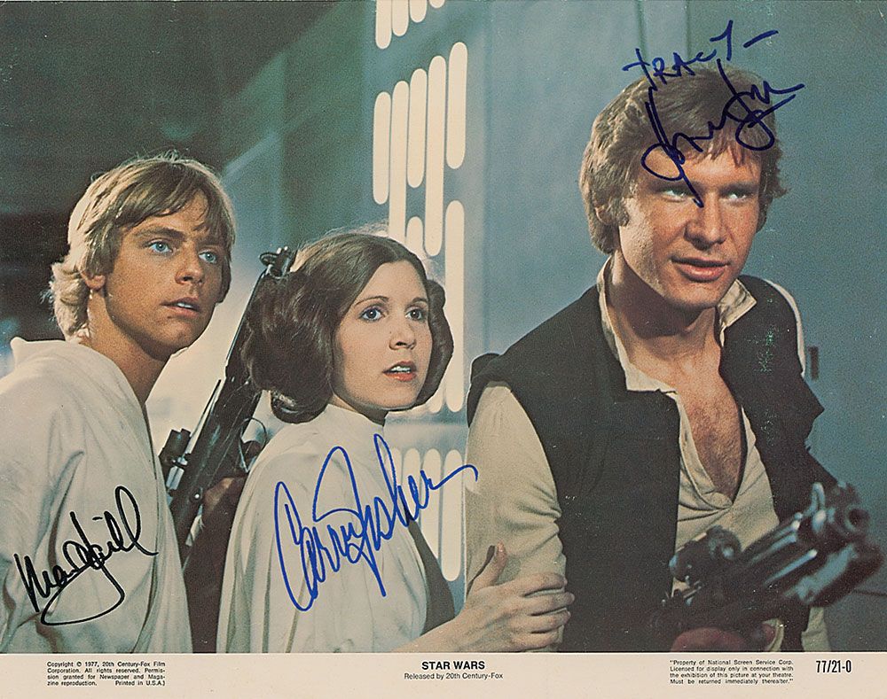 Color 14 x 11 lobby card for the classic 1977 film Star Wars, showing Luke Skywalker, Princess Lea, and Han Solo, signed in felt tip by Mark Hamill, Carrie Fisher, and Harrison Ford, with Ford adding an inscription to “Tracy.” In fine condition, with creases to corners.