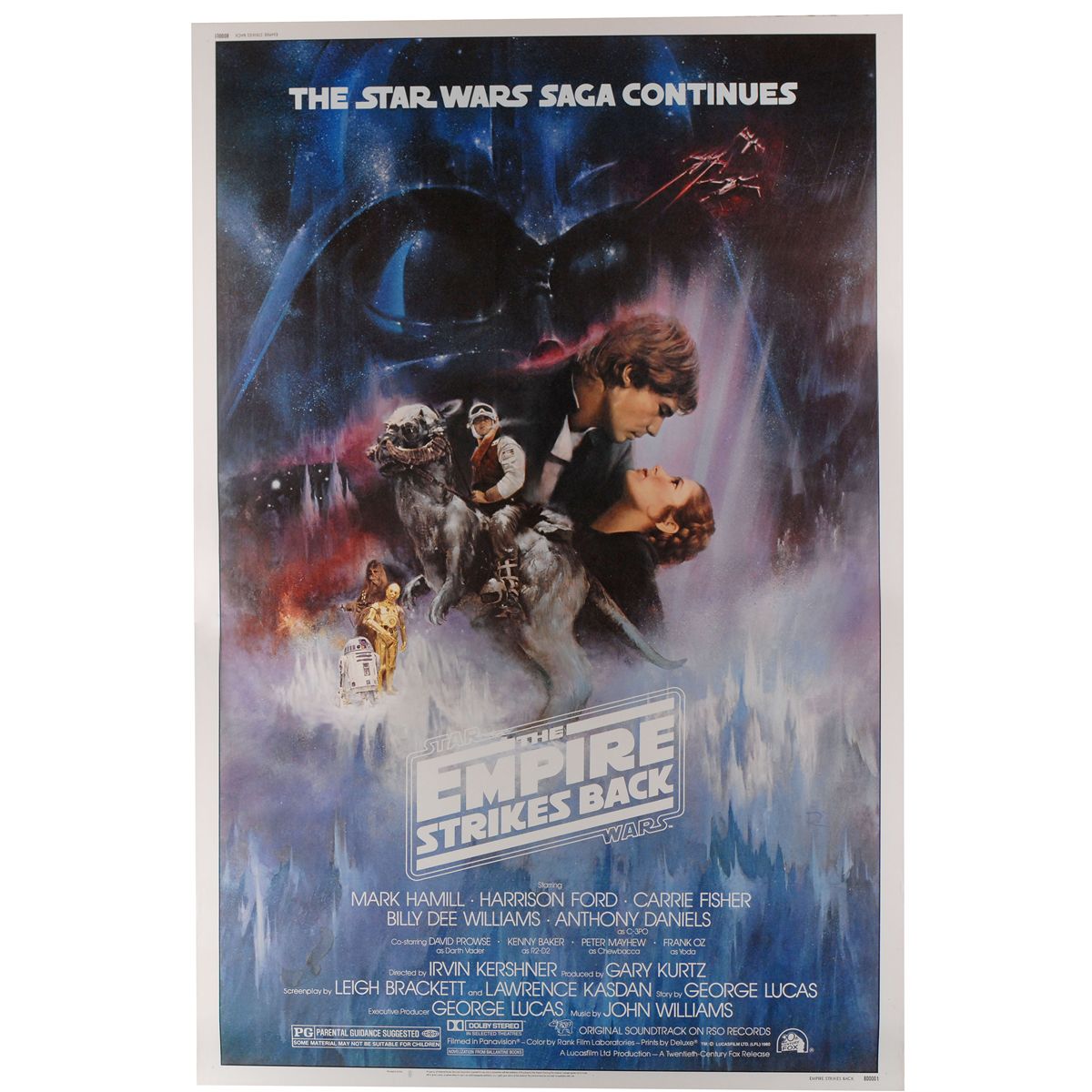 Super rare original color 40 x 60 ‘Style A’ movie poster for Star Wars: The Empire Strikes Back. Cardstock poster was produced in 1980 and features artwork by Roger Kastel, who was inspired by the 1967 re-release poster for Gone With the Wind, with many similarities between the two posters. Poster also has its NSS information printed in the lower border. Produced only for major motion pictures, there were fewer of these size posters produced due to the exponential cost as compared to standard one-sheet posters. Scattered edge creases and dings, and a few corner creases, otherwise fine condition. Rolled. This particular design was quickly replaced after its release as Billy Dee Williams was unhappy that his character, Lando Calrissian, was not featured on the poster. Later versions of this artwork had Williams’s character incorporated into the overall image.