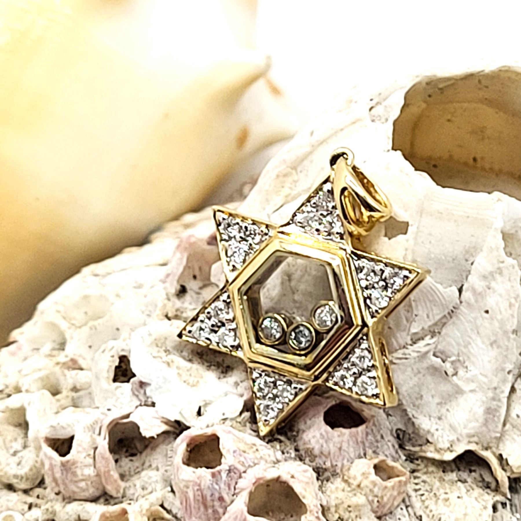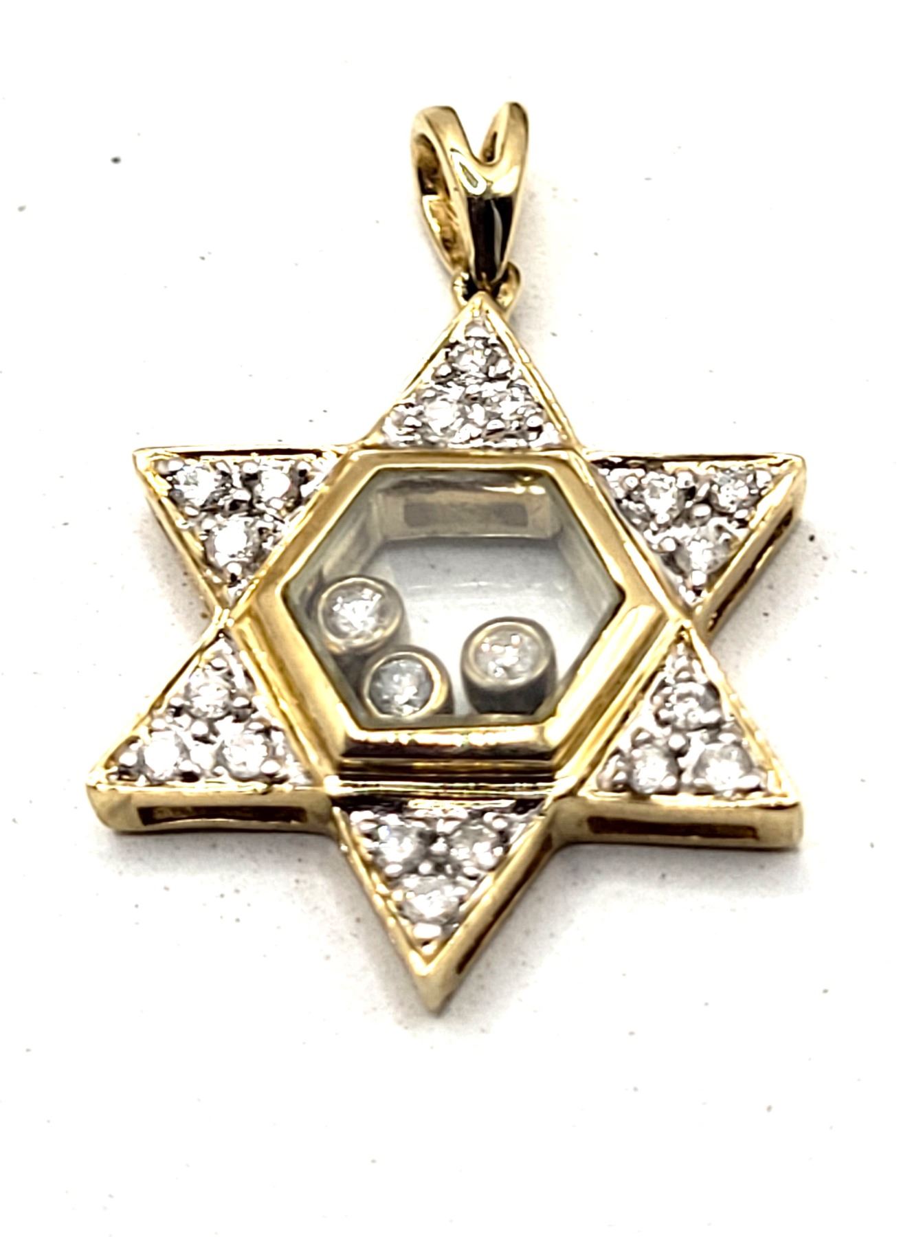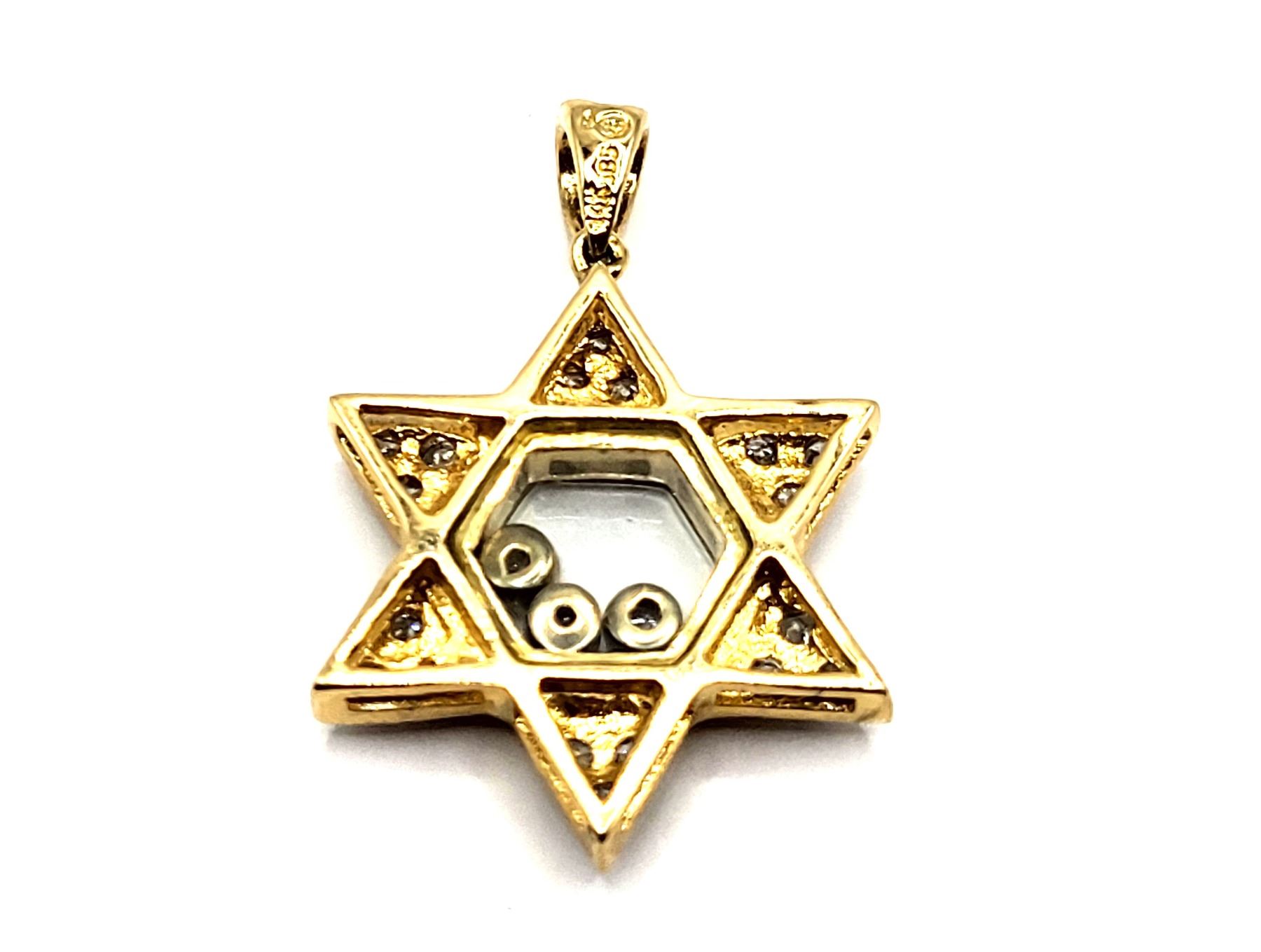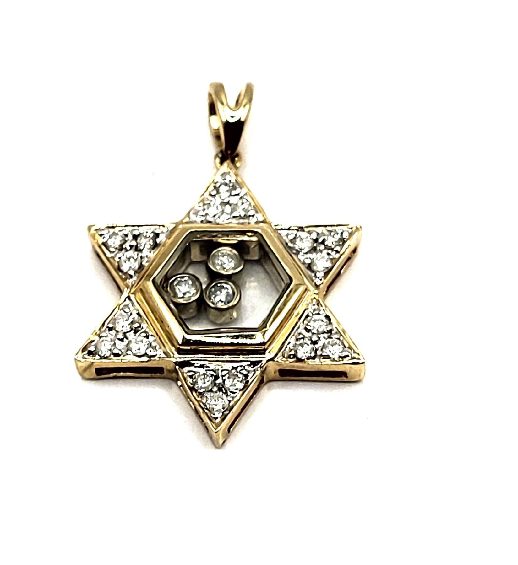 This is a 14 karat yellow gold Star of David pendant, featuring .25 carats total weight of round, brilliant-cut, H color, SI2-I1 clarity diamonds, some of which are encapsulated in the center of the star, while the others are in the rays of the star. The pendant is approximately 3/4& quot; diameter and has a split bail that can accommodate an approximate an approximate 2.5mm chain.Admin: G11241/19ntt