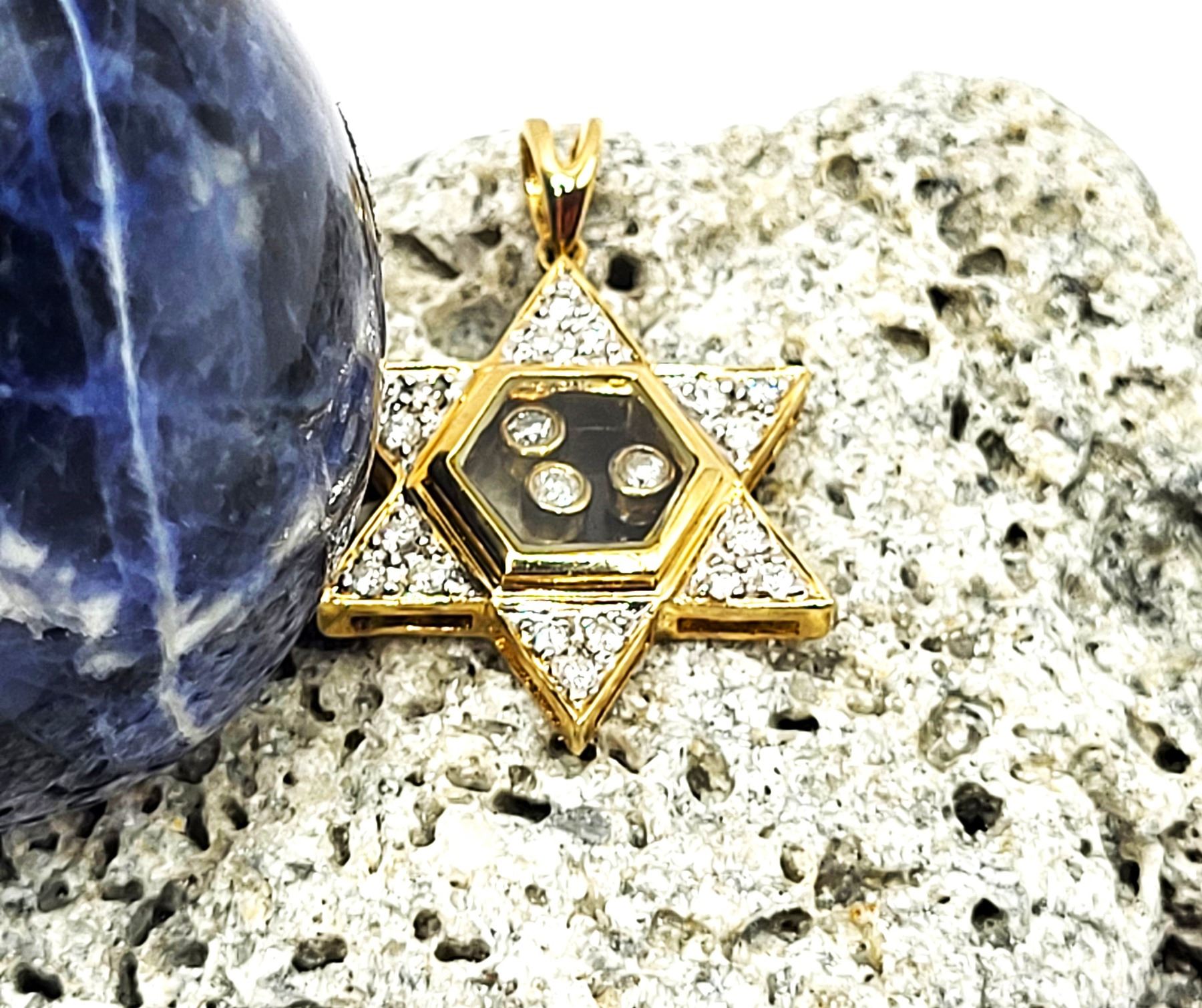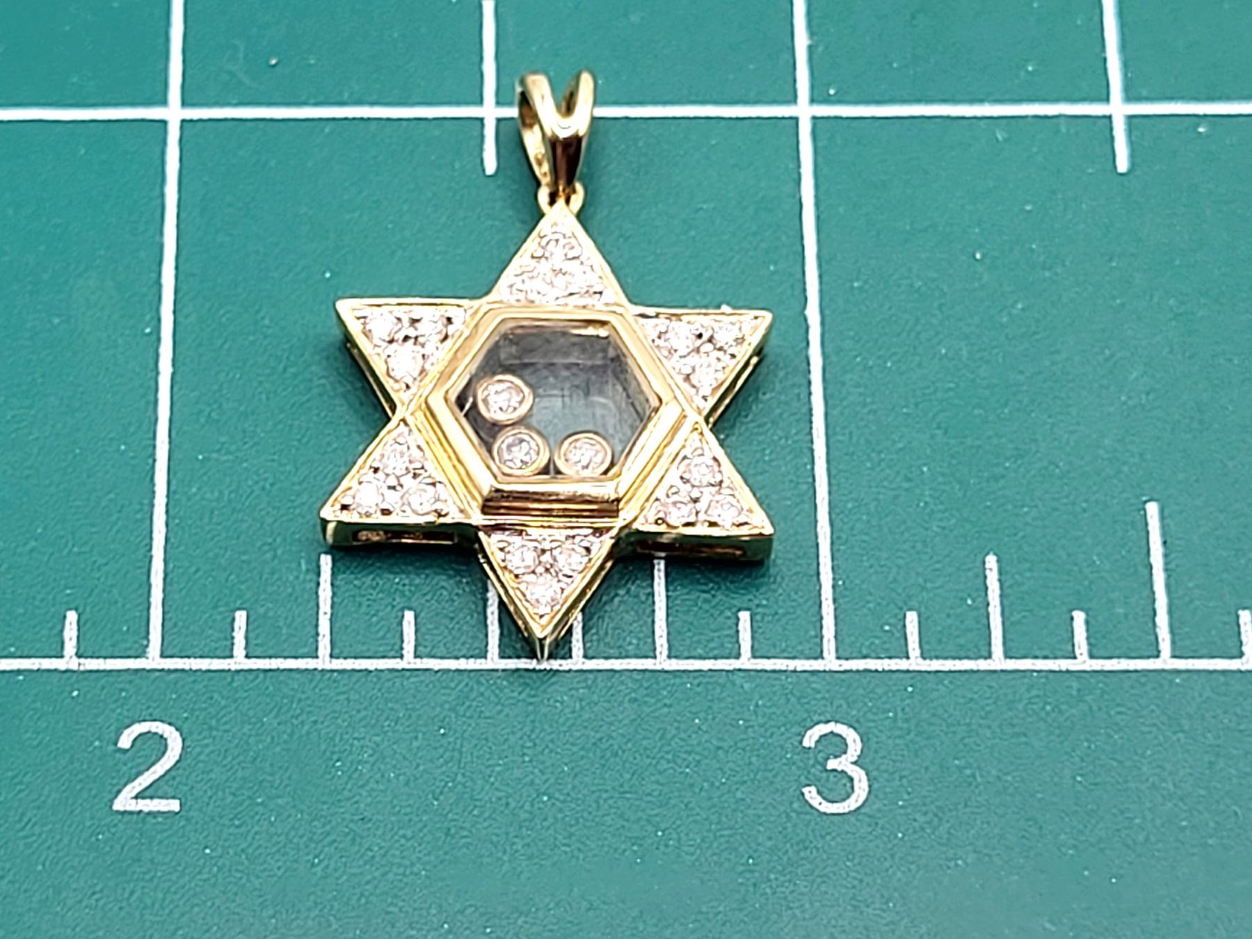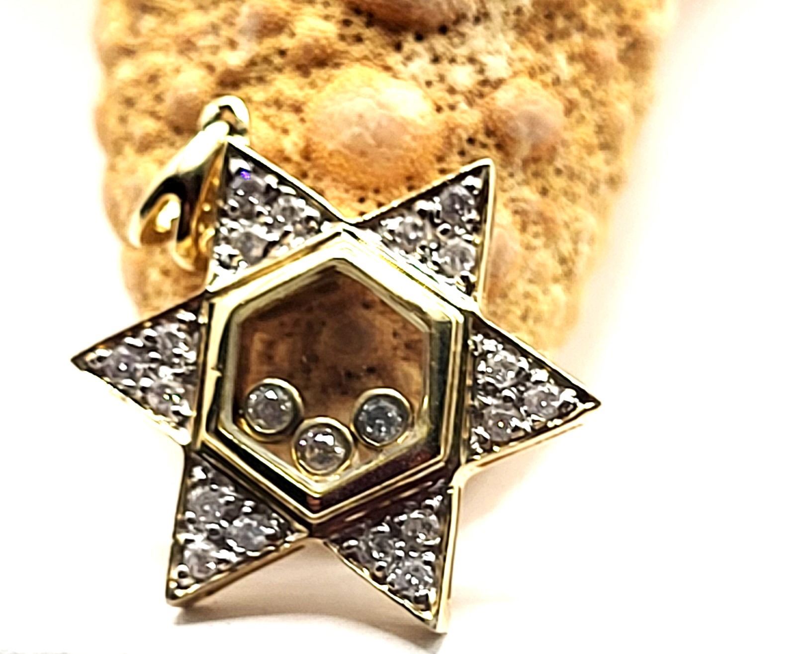 This is a 14 karat yellow gold Star of David pendant, featuring .25 carats total weight of round, brilliant-cut, H color, SI2-I1 clarity diamonds, some of which are encapsulated in the center of the star, while the others are in the rays of the star. The pendant is approximately 3/4& quot; diameter and has a split bail that can accommodate an approximate an approximate 2.5mm chain.Admin: G11241/19ntt