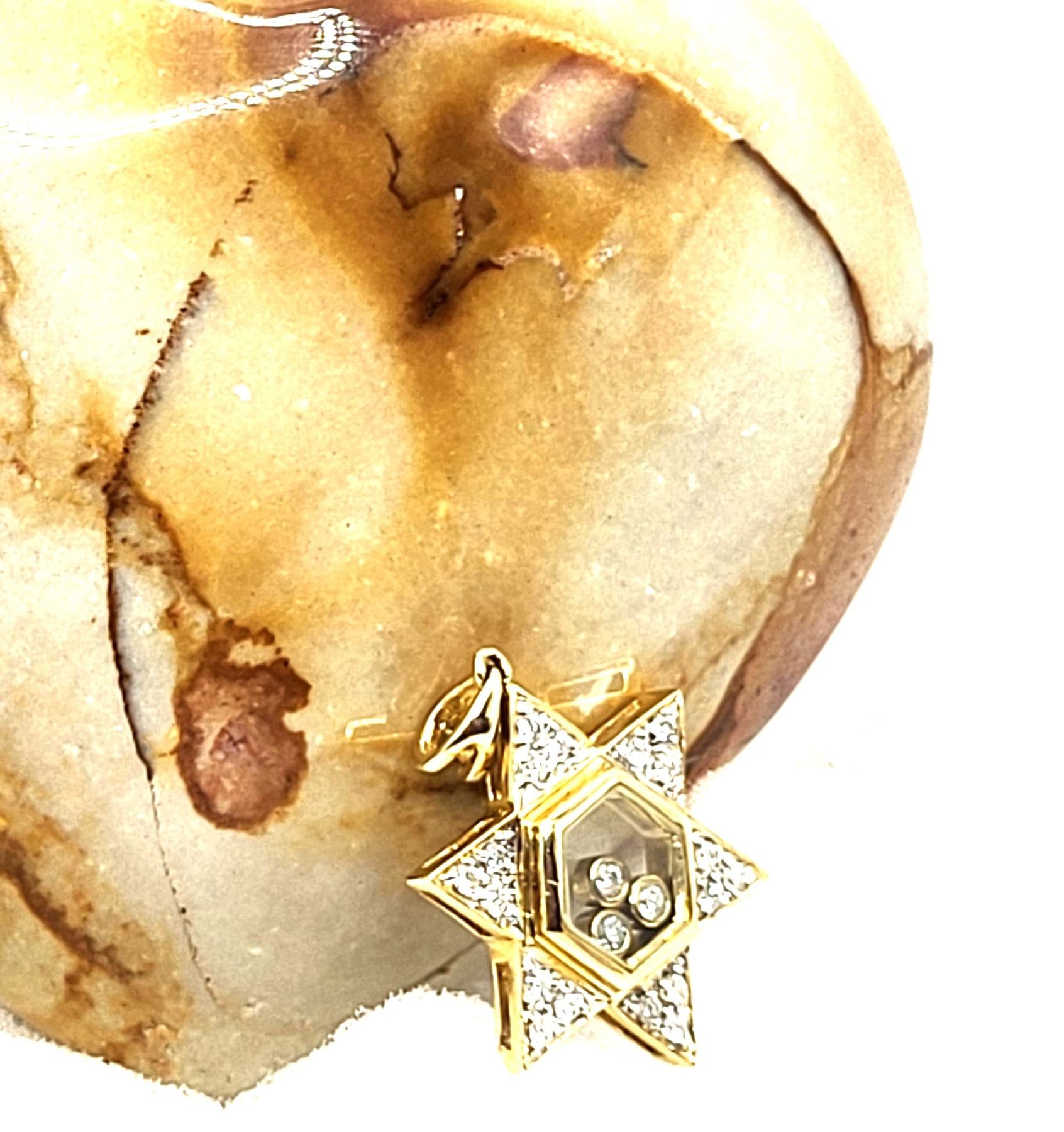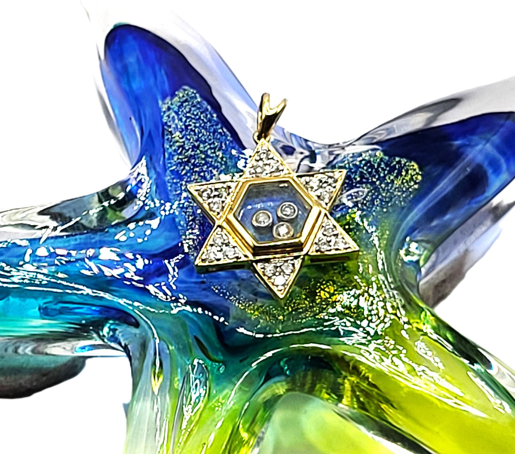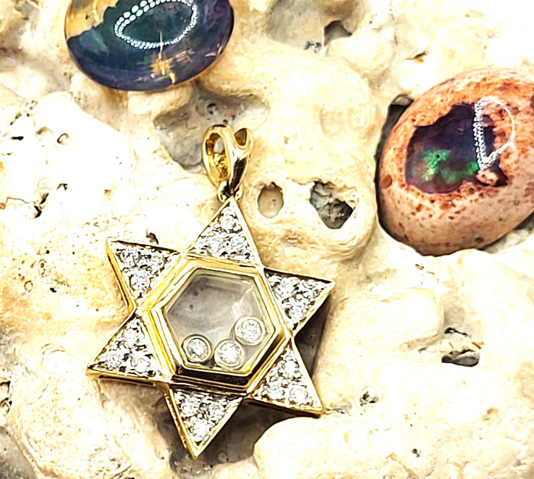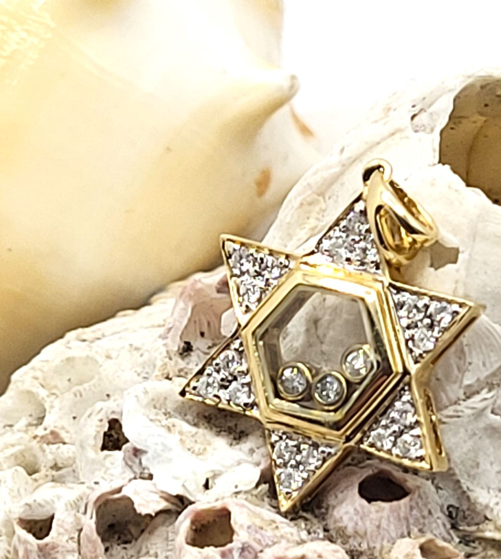 This is a 14 karat yellow gold Star of David pendant, featuring .25 carats total weight of round, brilliant-cut, H color, SI2-I1 clarity diamonds, some of which are encapsulated in the center of the star, while the others are in the rays of the star. The pendant is approximately 3/4& quot; diameter and has a split bail that can accommodate an approximate an approximate 2.5mm chain.Admin: G11241/19ntt