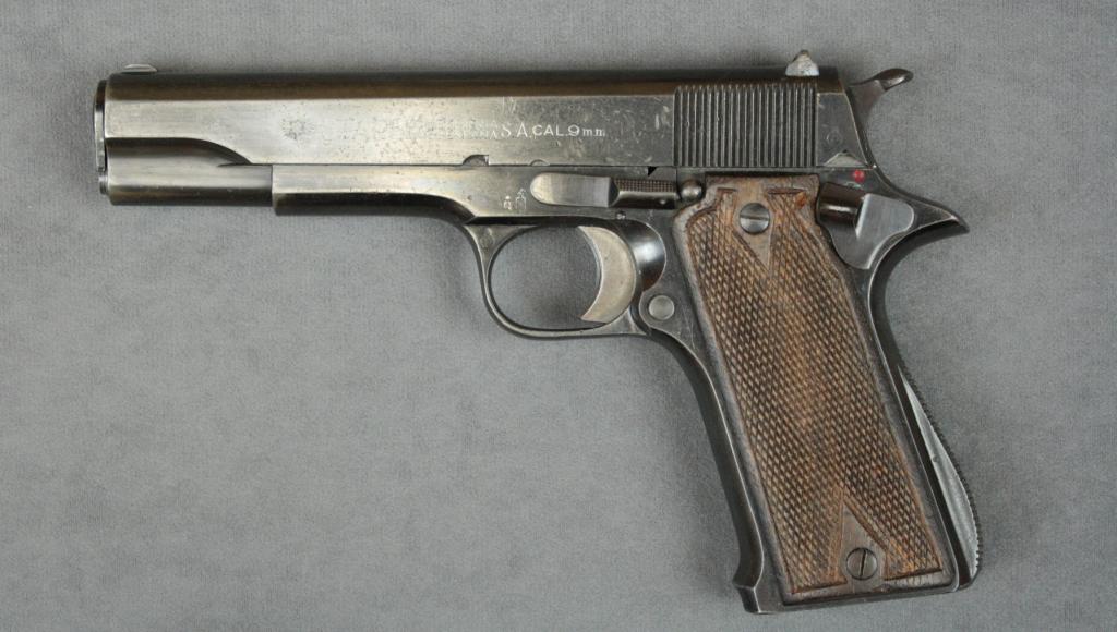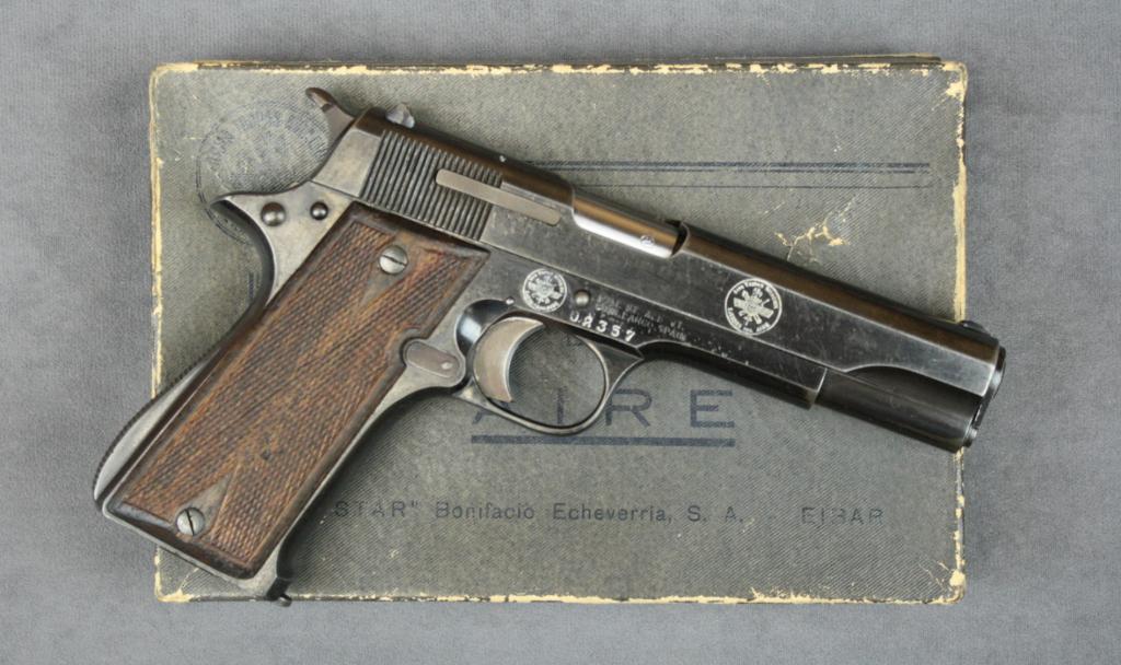 Star semi-auto pistol in factory box with extra magazine, 9mm cal., 5” barrel, black finish, checkered wood grips, #A287507. This gun is in overall very good to fine condition showing approx. 75% original finish, verygood bore, action, grips and markings which include the unusual stamping that looks like the seal for the Spanish Air Force; box is in overall very good condition and also is marked with the same seal. Est.: $350-$700.