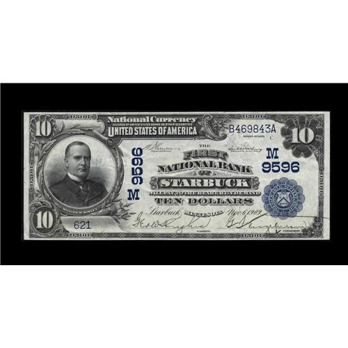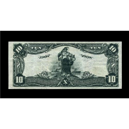 <B>Starbuck, MN</B></I> - $10 1902 Date Back Fr. 619 <B>The First NB</B></I> Ch. # 9596<BR>Excellent penned signatures of Geo. W. Hughes and vice president (later president) G.I. Engebretson are found on this coffee note that has several folds and crinkles. <B>Very Fine-Extremely Fine.</B></I>
