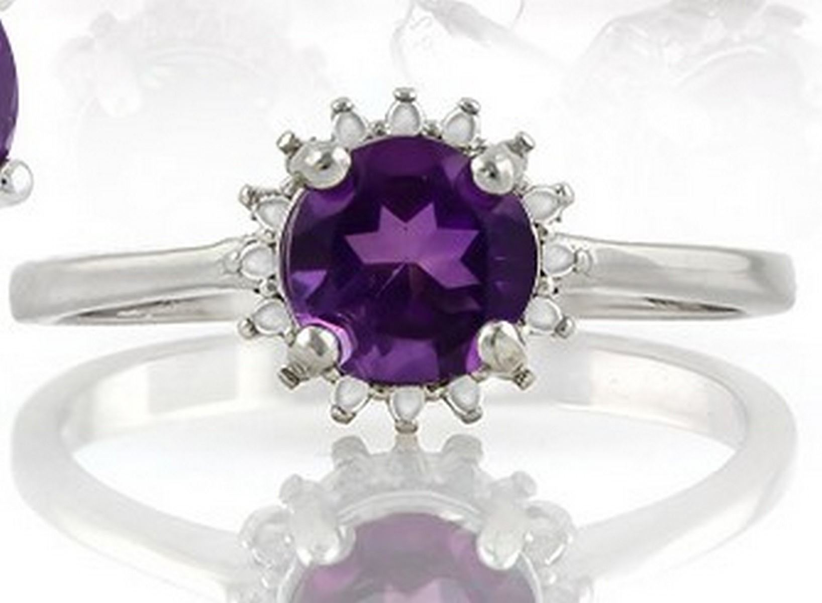 Modern starburst ring with 3/4CT Amethyst round cut gemstone set in Platinum over Sterling Silver. Size 7. 1.9g