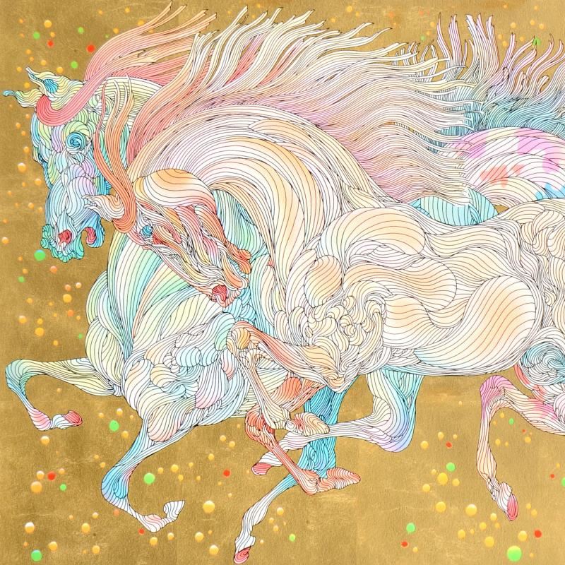 "Stardust" is a limited edition serigraph on paper with hand laid gold leaf by Guillaume Azoulay, numbered and hand signed by the artist. Includes Letter of Authenticity. Measures approx. 35" x 25" (border), 31" x 19" (image).