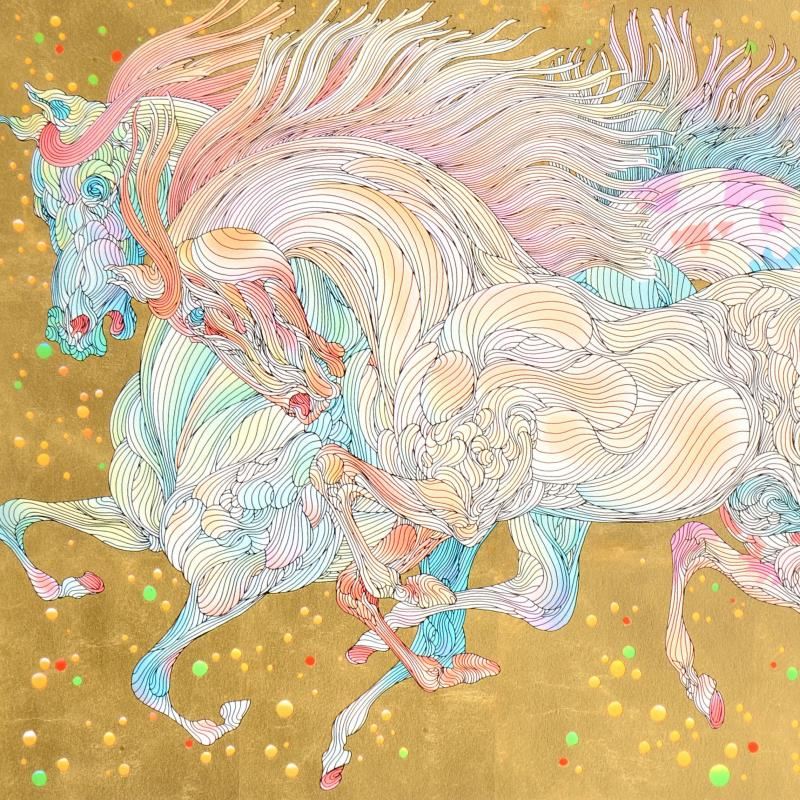 "Stardust" is a limited edition serigraph on paper with hand laid gold leaf by Guillaume Azoulay, numbered and hand signed by the artist. Includes Letter of Authenticity. Measures approx. 35" x 25" (border), 31" x 19" (image).
