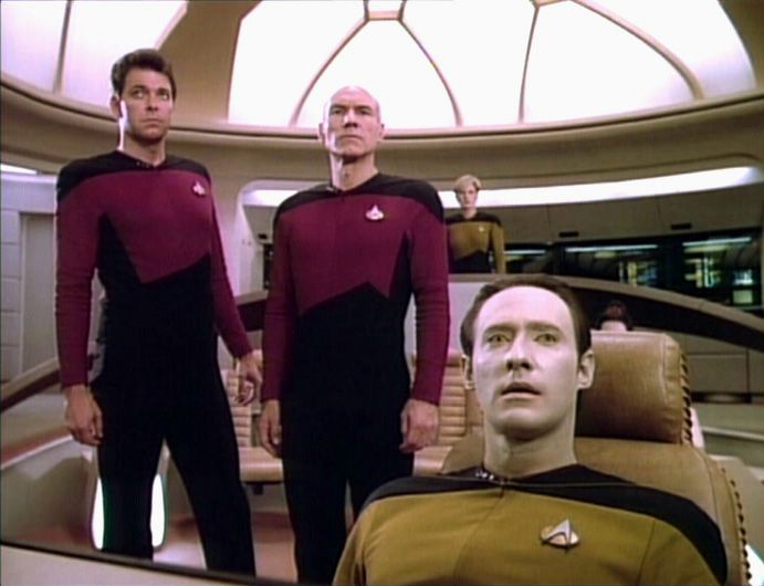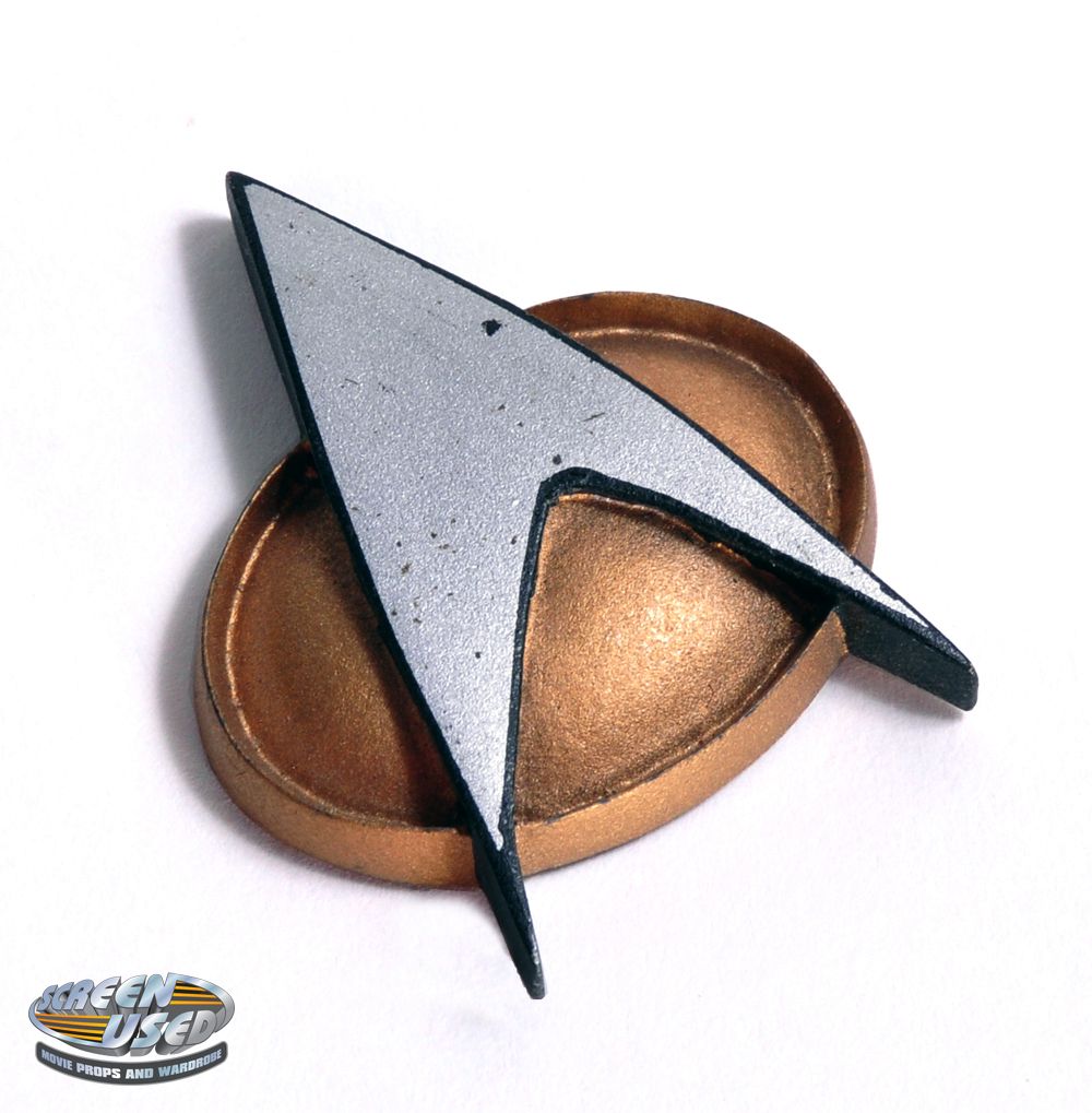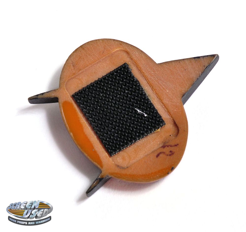 (Paramount-TV, 1987-94) This Starfleet comm badge was custom made for the production for use by various actors. Made of resin with Velcro applied to the back for attachment to the costume.