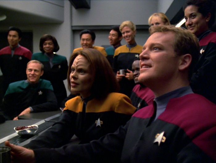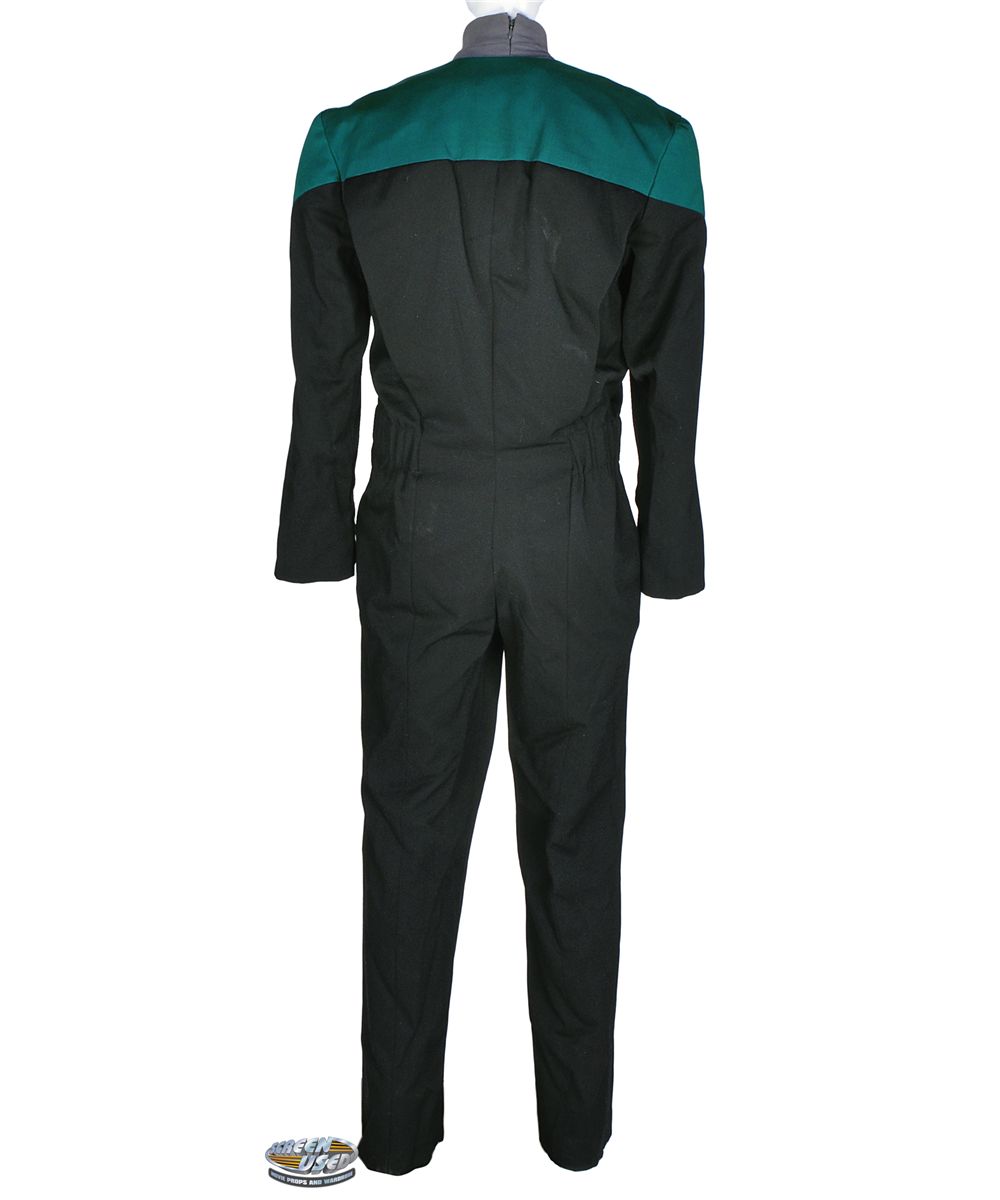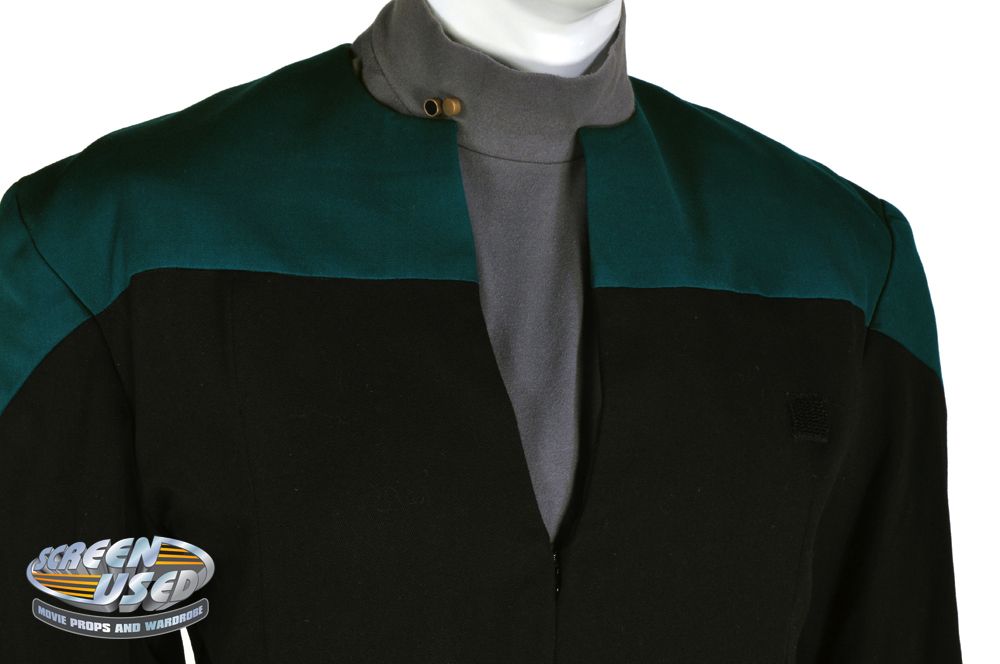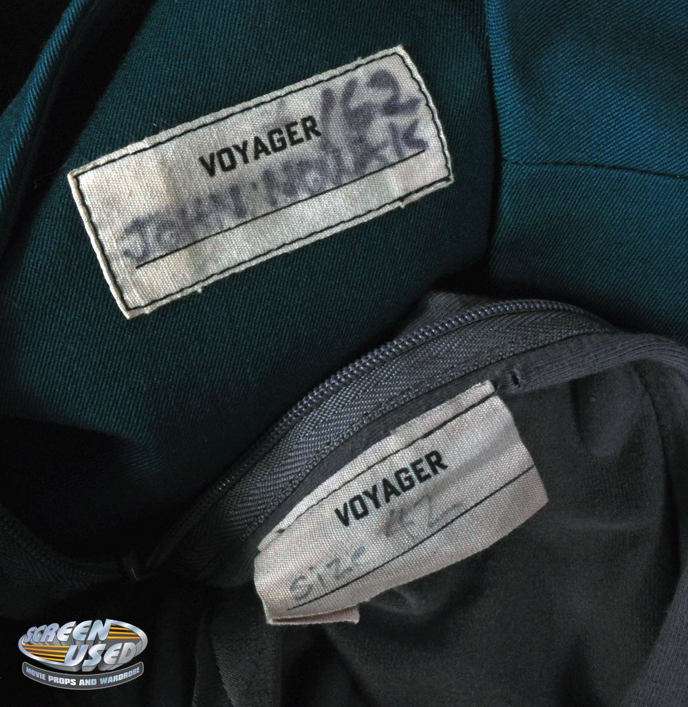 (Paramount-TV, 1995-2001) This is a Star Trek VII: Generations-style uniform jumpsuit that was continued to be used through Deep Space Nine and Voyager. It is a black uniform with sciences blue shoulders and front zipper closure that comes up to just below the color line. The gray undershirt also zips up the center and has the rank pin attached. Both the undershirt and jumpsuit have Voyager tags attached, with the tag in the jumpsuit reading, "162, John Novak," and in the shirt, "Size 42." Some wear from use, but remain in good condition.