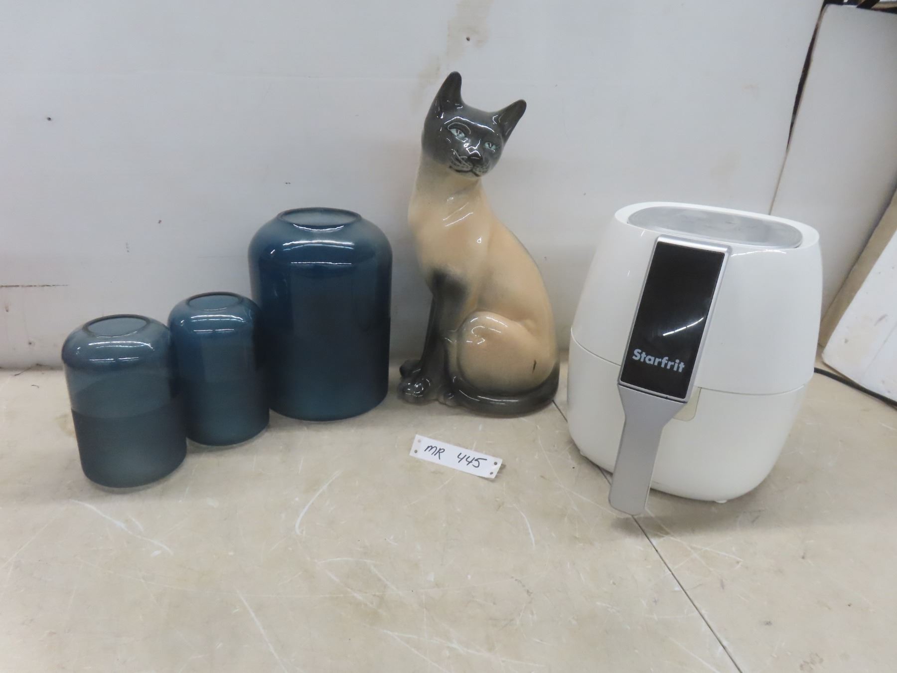 Starfrit Air Fryer, Ceramic Cat, 16" Tall, and Three Vases