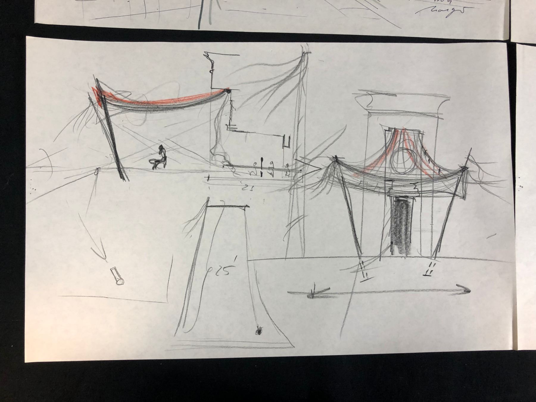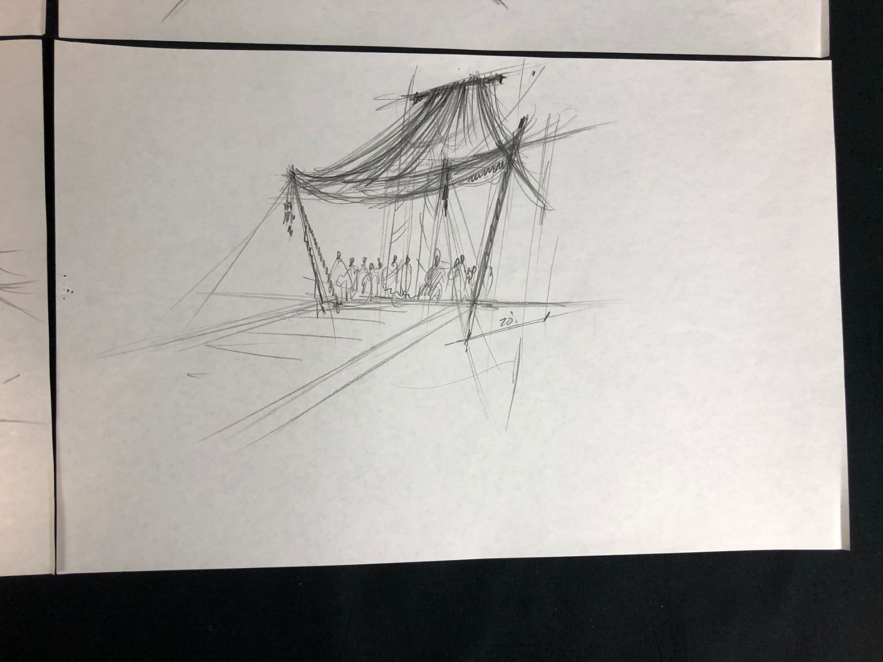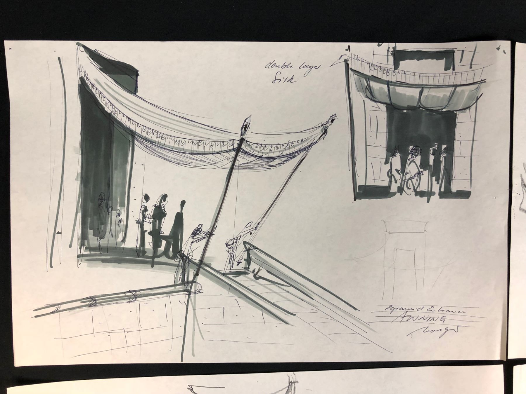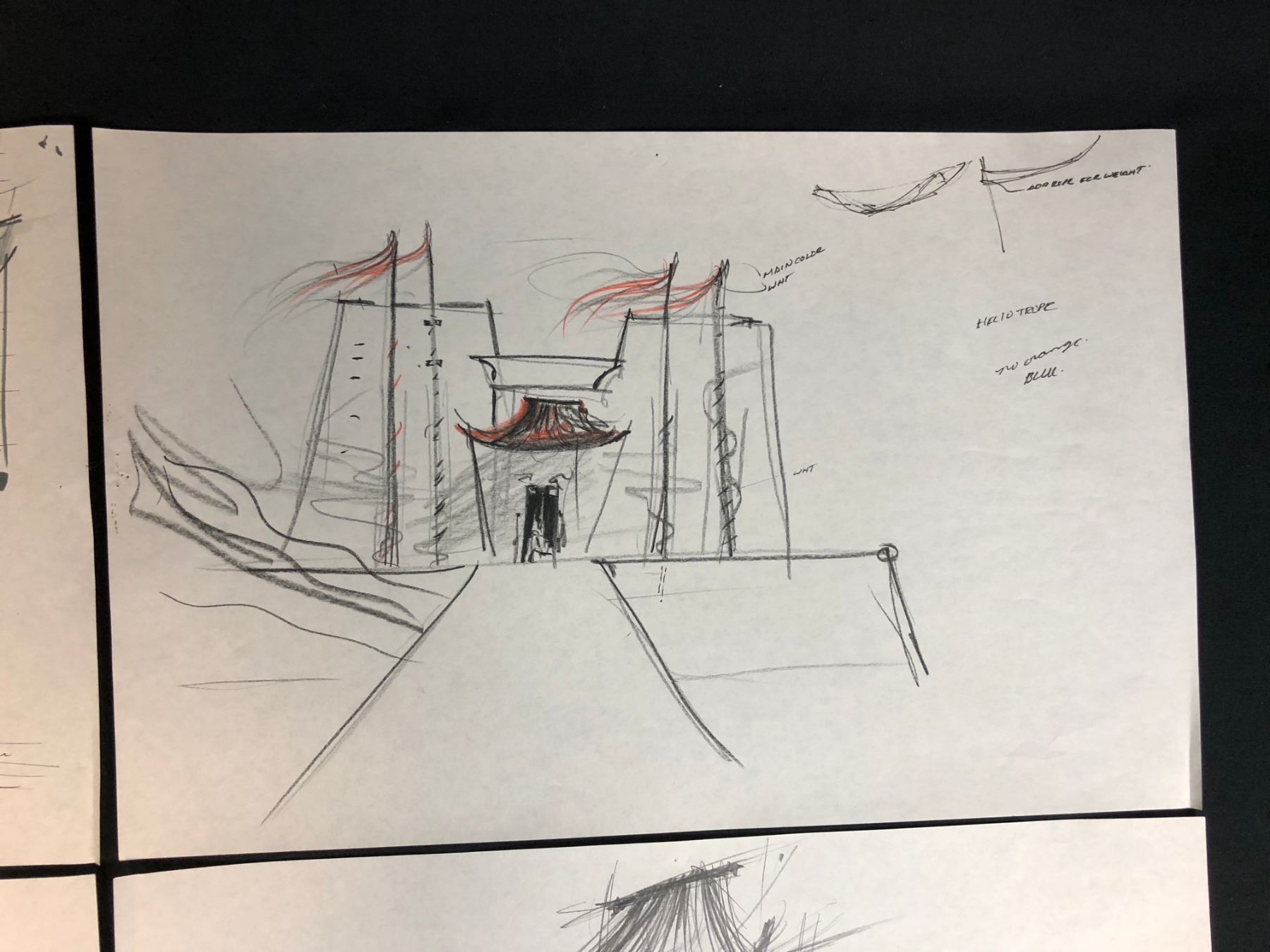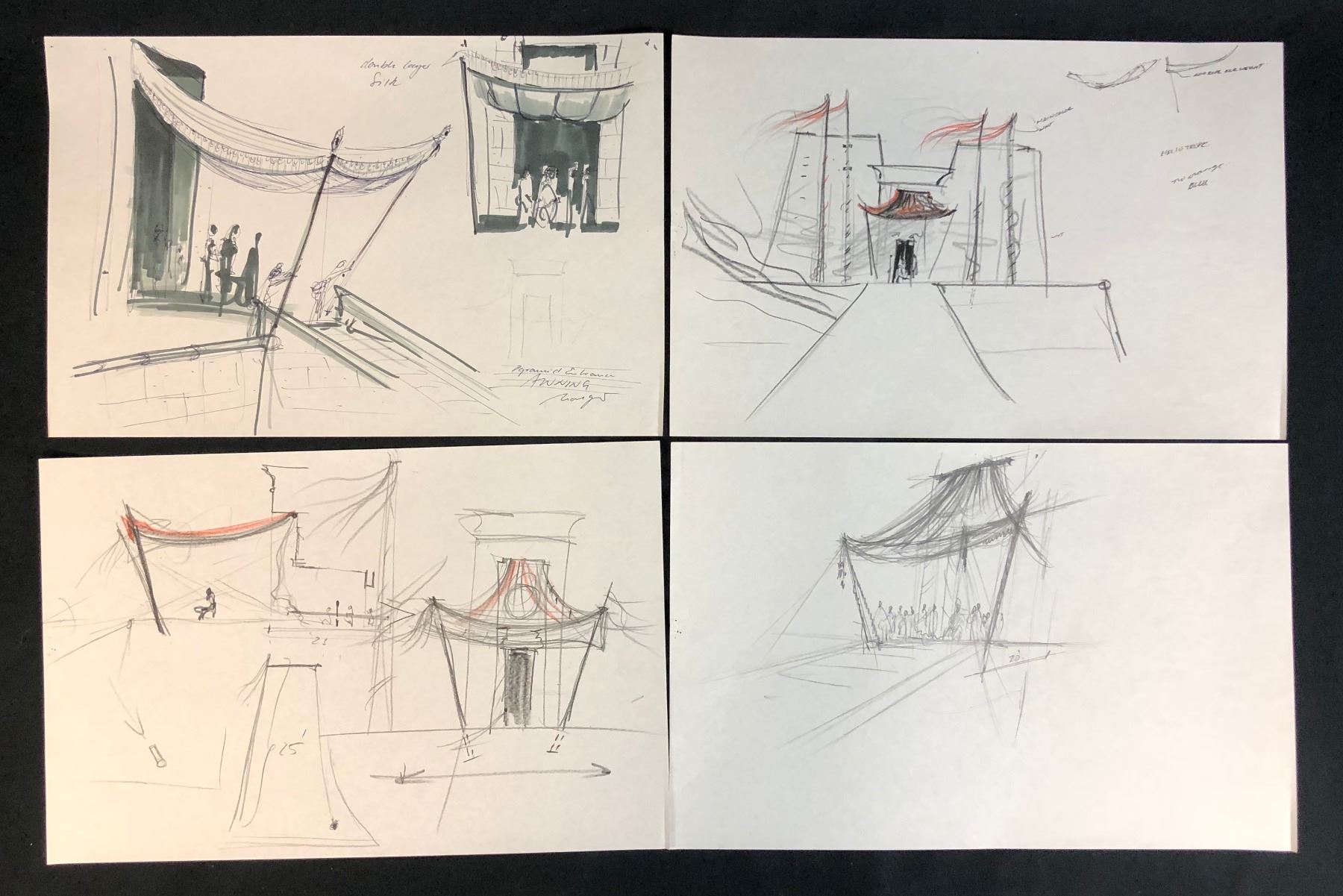 Collection of 4 hand drawn drawings depicting the construction of the pyramids from the science fiction adventure film "Stargate" (1994) written by Dean Devlin and Roland Emmerich, the film is the first release in the Stargate franchise. Directed by Emmerich, the film stars Kurt Russell, James Spader, Jaye Davidson, Alexis Cruz, Mili Avital, and Viveca Lindfors , where an interstellar teleportation device, found in Egypt, leads to a planet with humans resembling ancient Egyptians who worship the god Ra.