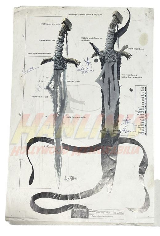 Original concept art (Production used print) for the sword and scabbard used by "Ronon Dex", played by Jason Momoa in the military science fiction adventure television series 'Stargate: Atlantis' (2004-2009), a spin-off series of Stargate SG-1, which follows the events of Stargate SG-1's seventh season finale episode "Lost City" and eighth season premiere episode "New Order", in which the cast of that series discovered an Antarctic outpost created by the alien race known as the Ancients. In the pilot episode "Rising", Dr. Daniel Jackson discovers the location of Atlantis, the legendary city created by the Ancients, and Stargate Command sends an international team to investigate it.