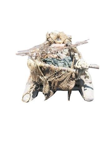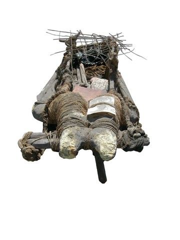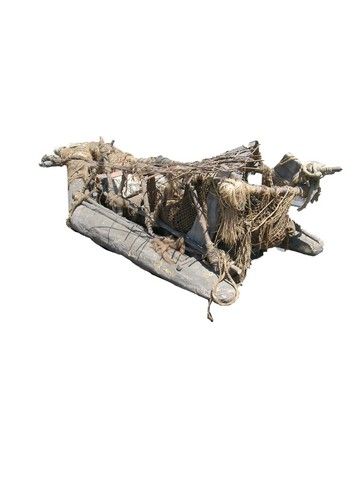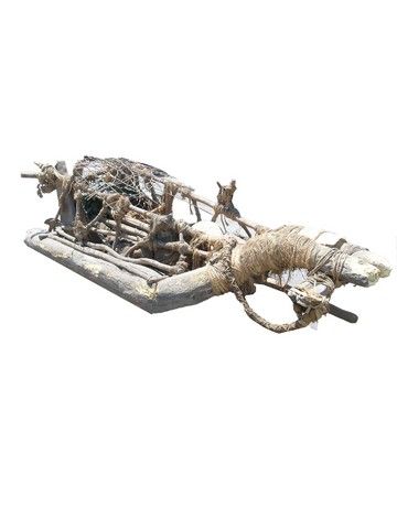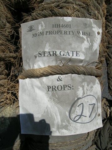 From one of the Stargate series, this is a large size wooden 'desert sled' prop. The 'sled' has been hand constructed and is highly detailed, with numerous ropes, nets, twine, and burlap sacks. The base 'pontoons' are made from hard foam, coated in resin, and painted to resemble wooden beams. Inside the seat area are various props, including faux rocks, wooden stakes, ropes and other desert related items. Acquired from MGM studios, and comes with an 'MGM Property Warehouse' sheet. Oversized item. Additional Postage Required.
