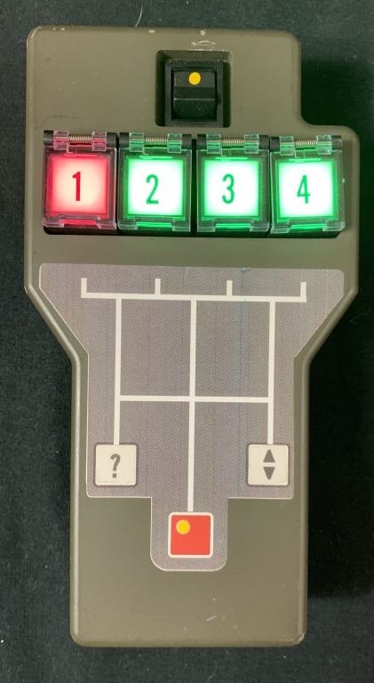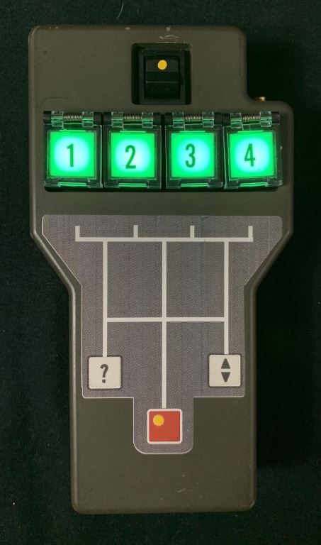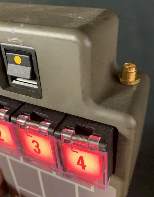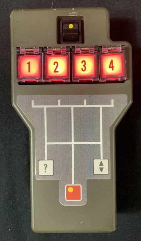 The detonator has flip up plastic pieces to allow the user to get to the switches that light up green and when pressed turn to red.
