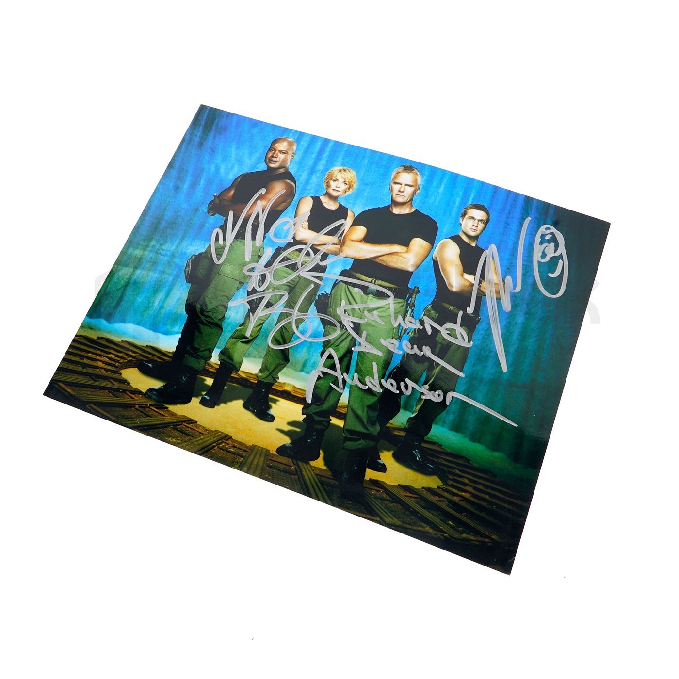 Autographed 8x10 glossy photograph of the main Startgate SG-1 team from the science fiction television show Stargate SG-1. A team of explorers made up of soldiers and scientists travels through a Stargate, an ancient portal to other planets. They use the Stargate to explore new worlds, forge ties with friendly civilizations and protect Earth from hostile forces. The TV series is based on the theatrical film `Stargate'. This piece was hand signed by all team members in silver ink and is a promotional image used in season seven. This piece remains in excellent, unbent condition.