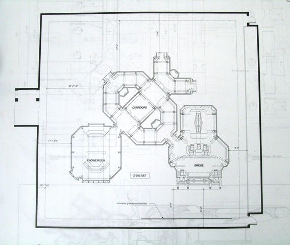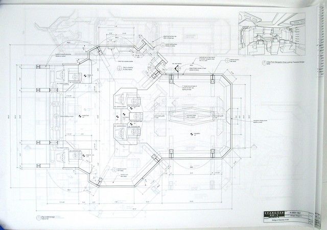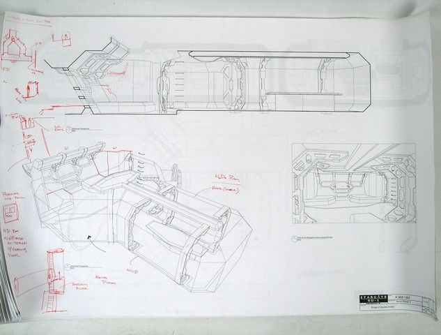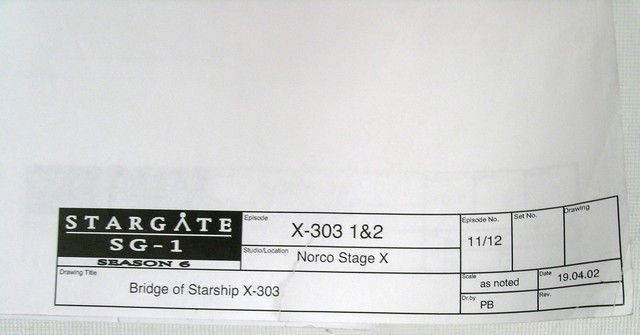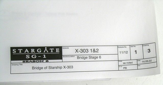 This is an extremely rare complete set of all 23 of the original production used blueprints for the X-303 Prometheus and BC-304 Daedalus class earth starship set featured in all three Stargate television shows. The set features two and three dimensional plans for the bridge, corridors, corridor beams, command consoles, doors, map bridge table, and several other elements of the set. 23 printed black and white images are on vellum or white paper, some pages have ink and marker notations from the production design crew. Comes with a Hologram seal Certificate of Authenticity from Propworx who was authorized to sell SG-! props and costumes for MGM Studios. It is signed by Propworx CEO Alec Peters. Each measures 36in x 24in.