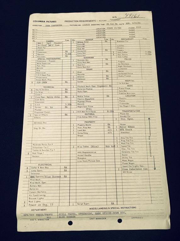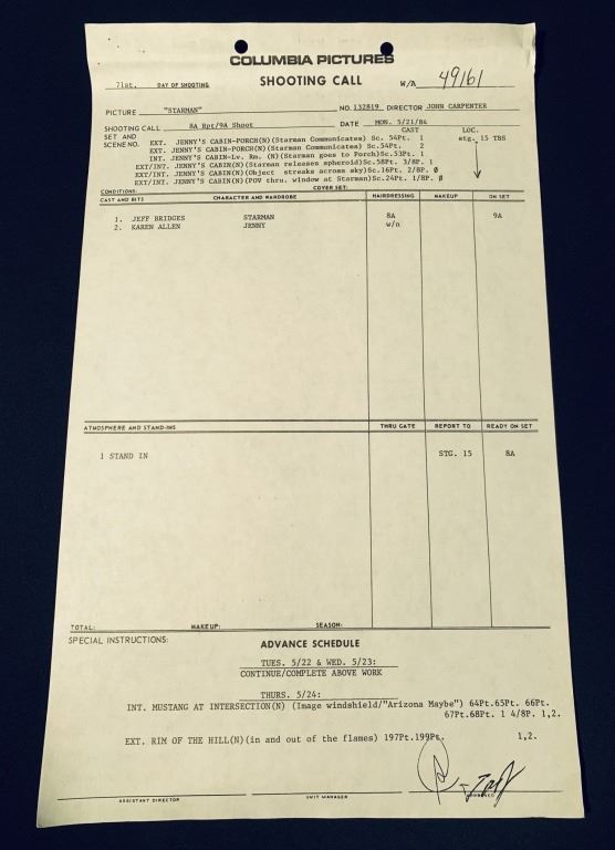 Original production call-sheet used in the John Carpenter directed romance science fiction film 'Starman' (1984).