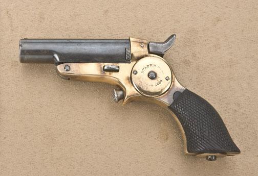 Starr.41 caliber rimfire, single-shot “button trigger” derringer. The barrels have been lightly refinished as has the stocks and the frame polished. The action is good, interior good. Markings visible with March 10th 1864patent on left, inspection right. One of the scarcest rimfire derringers that are seldom encountered. Est: $600 - $900