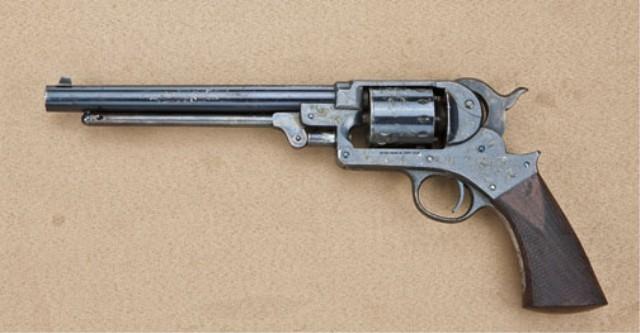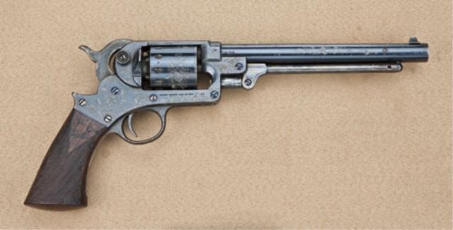 Starr .44 percussion caliber single-action revolver 8” barrel, blued finish, checkered wood grips, period scroll engraved, serial #52790. The pistol shows Belgian proofs and no inspection marks. The pistol is engraved in a light floral scroll cut through the blue and the military quality wood grips are nicely commercially checkered at time of engraving. Approx. 6 star revolvers have surfaces, two pairs, that are engraved nearly identically in this mannor. It is our theory that they were embellished to market them after the Civil War when sales were slow. The pistol shows 80-90% original blue finish drifting at the edges, still very bright on the barrel. 90% plus fiery case colors on hammer and loading lever. The grips are very good with some minor storage marks and handling. The action is good, the bore is near excellent. The small parts and screws show bright original blue and the revolver has seen very little to almost no use. A couple of minor storage scratches. Est: $4,000 - $6,000