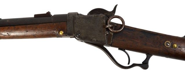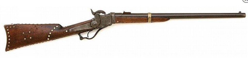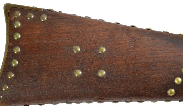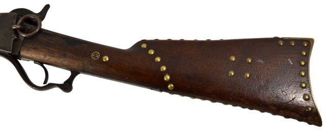 Rare, fine, early Sioux captured Starr Civil War Carbine serial #15463, .54 caliber, 21" round barrel with a bright very good bore. This carbine is not listed in the Springfield research records therefore among the 15,000 serial range that went to the 9th Pennsyvania cavalry including numbers 15456 and 15473. Metal surfaces of carbine retain a pleasing, generally smooth gray brown patina with some faded original color case-hardened finish evident in some areas. Indian Scout took the weapon west, decorated with brass tacks showing Western Frontier use after the Civil War. . A neat rare Starr carbine, with Indian use and artistic tack work of the period.