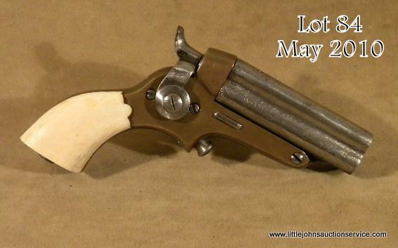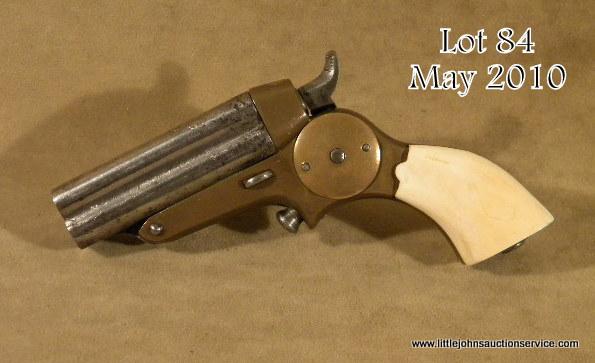 Starr Four Barrel Pepperbox derringer, .32 cal., 2-3/4” barrels, brass frame, traces of engraving on barrels, ivory grips, #NVSN. This gun is in overall good condition showing a nice patina to the brass frame and a lighter patina to thecircular sideplate; the bores are fair, the action good with the button trigger. The barrels have been cleaned but still show some engraving at the breech and muzzle ends. The grips appear old but may not be original to this derringer. From theVictor Stouffer Collection. Est.: $700-$1,400.