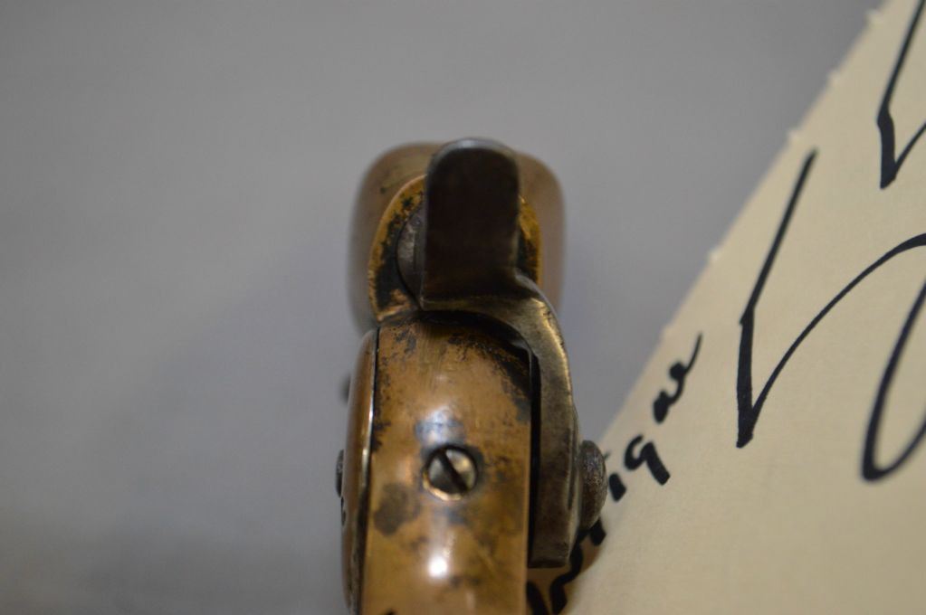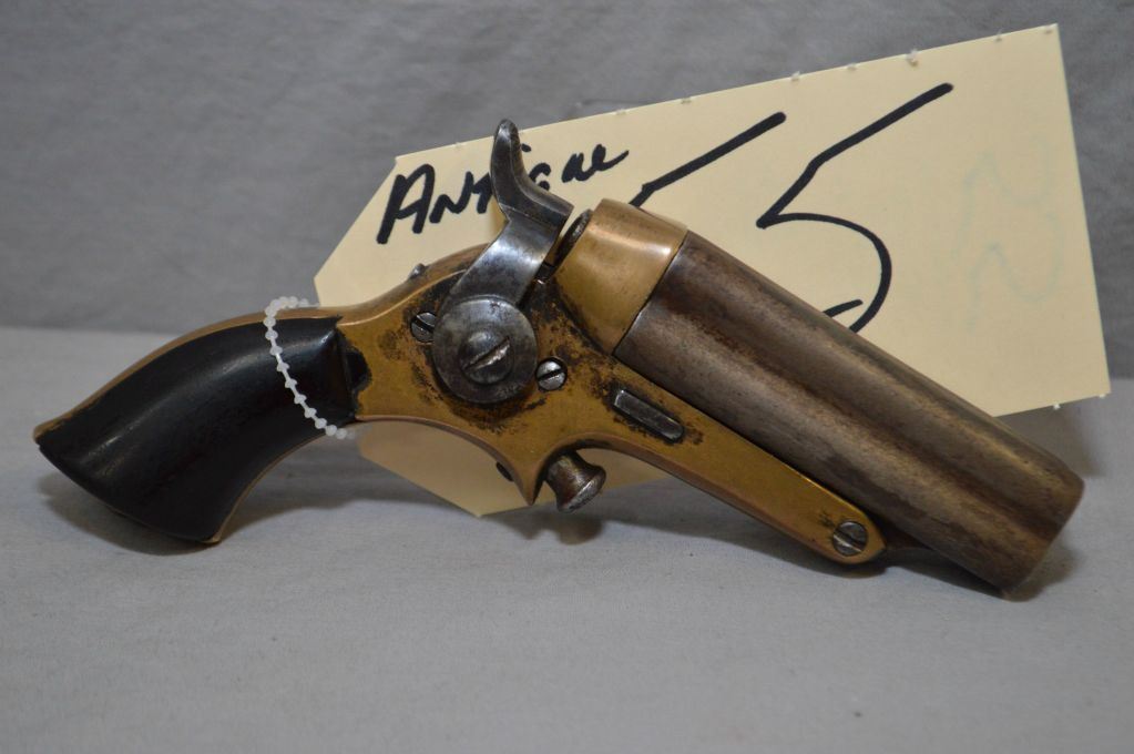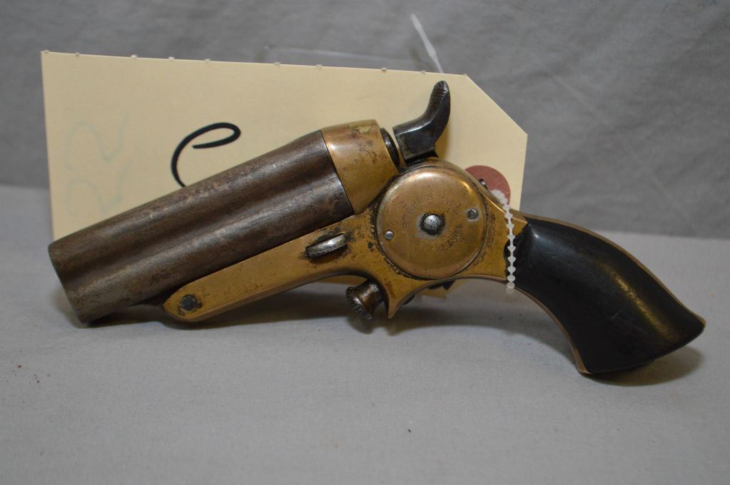 Starr ( Merrill Patent Fire Arms Manfg ) Model 4 Th .32 Rimfire Cal 4 Shot Pepperbox Pistol w/ 2 3/4" or 70 mm bbls [ blued barrels turned brown, brass frame marked Starr's Patent May 10,1864, barrel tips forward for loading, outside side mounted hammer, walnut grips w/ small chip out of right side, 4 th models have rounded breech with neither spring visible on right side, 65 - 75 % of production were estimated at 1500 only for 4 th and 5 th models, out of Total Production just over 2000, Circa 1864 - 1869 ] Ser # 6B