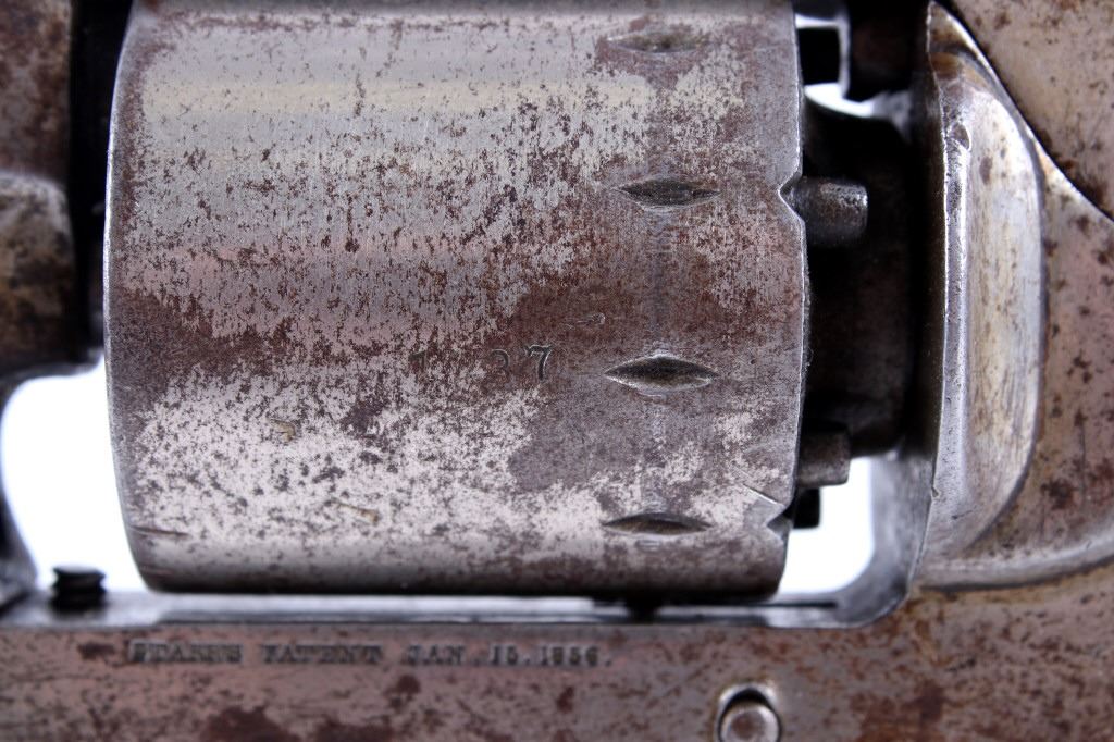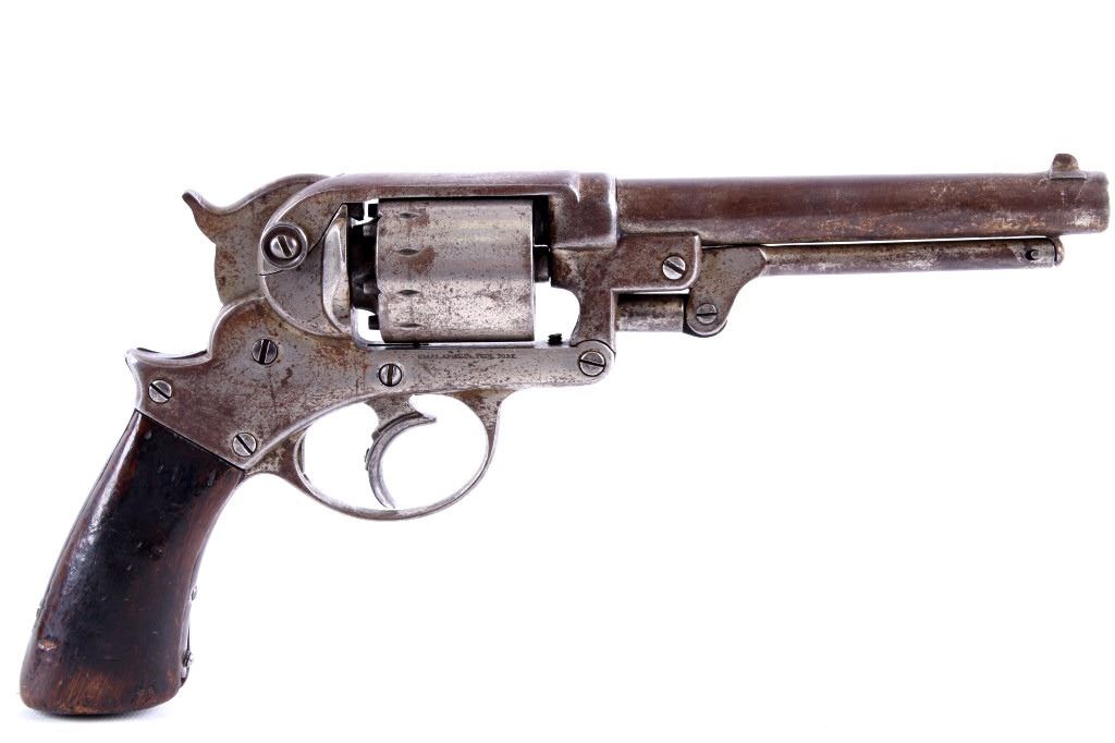 Offered in this lot is a Starr Model 1858 Double Action .44 Percussion Army Revolver. This Model 1858 Double Action features a 6" nickel finished round barrel with dovetailed front blade sight. The frame, cylinder and barrel all show an evenly built up patina. This revolver was manufacture between the late 1850s to early 1860s and shows the serial number 1837. The cylinder and barrel are chambered in .44 percussion. The walnut grips are in fair shape with dents and scratches associated with age and use. The frame is marked "Starrs Patent Jan. 15. 1856" on the left and "Starr Arms Co. New York" on the right. The cylinder shows a faded serial number as well. Serial Number: 1837. This firearm qualifies as an Antique, and does not require FFL Transfer or NICS Background Check.