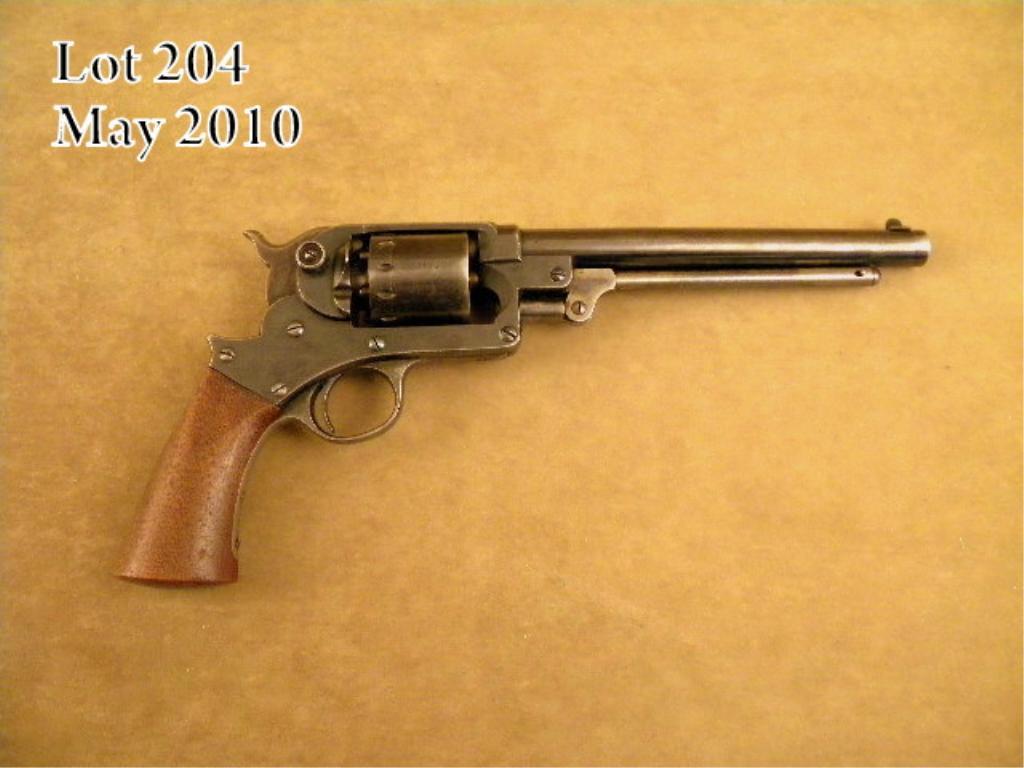 Starr Single Action Model 1863 Army percussion revolver, .44 cal., 8” round barrel, blue and case hardened finish, smooth wood grips, #50109. This gun is in overall excellent condition showing approx. 90% original blue finish and approx. 90%original case colors on the loading lever and hammer; crisp action, sharp markings, very good bore, very good + grips with no visible inspector cartouches. A very nice example of this popular Civil War era revolver. From the Victor StoufferCollection. Est.: $3,000-$4,000.