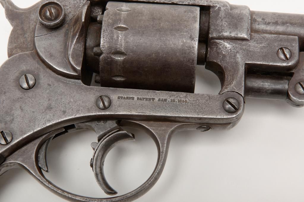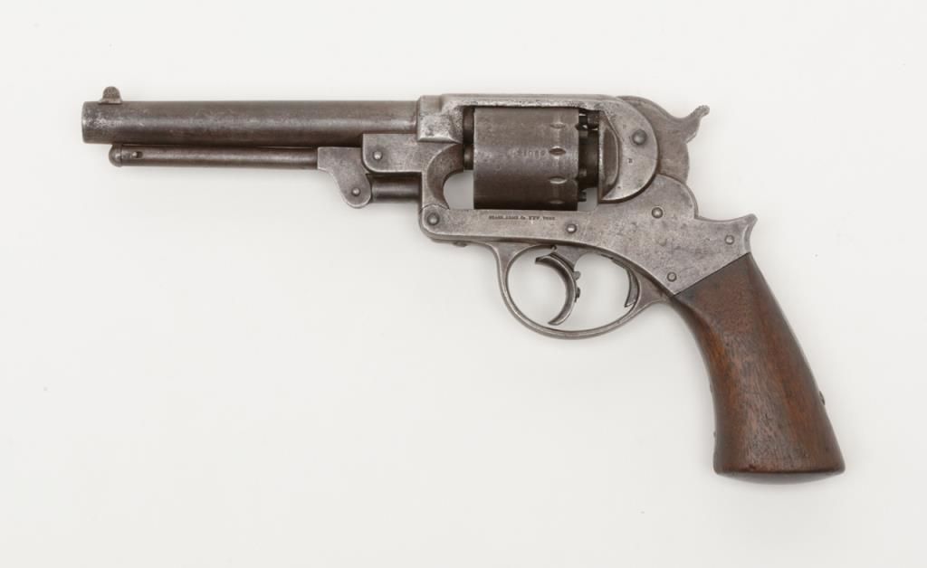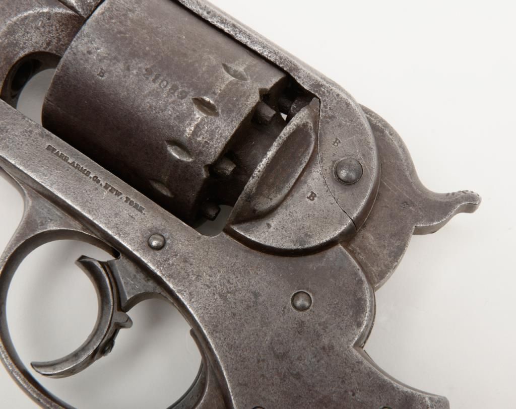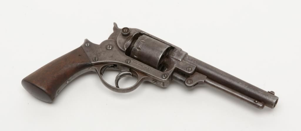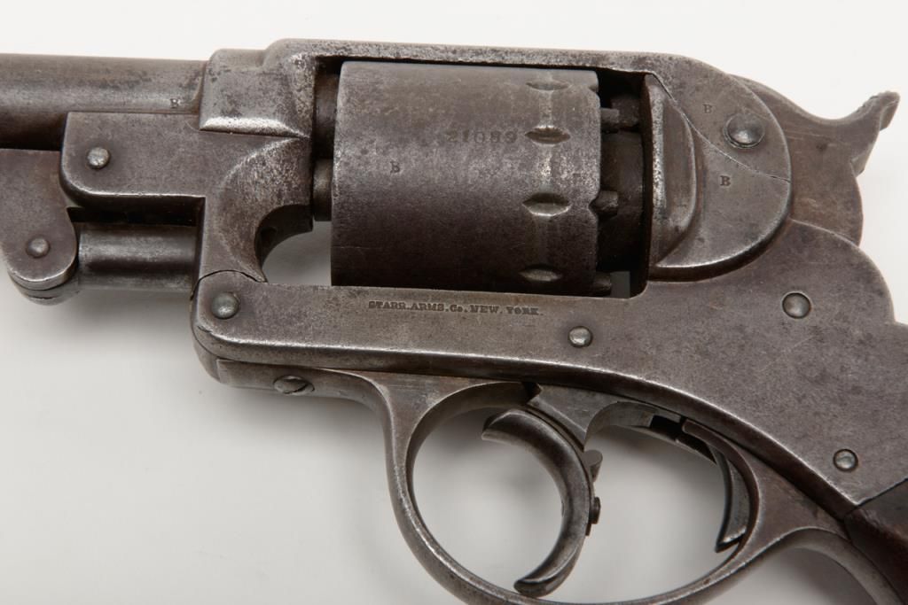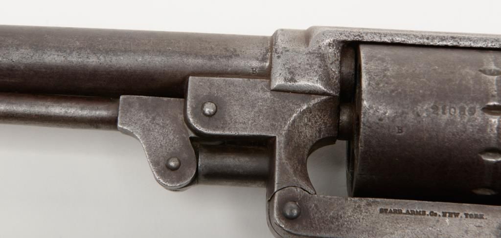 Starr double action .44 caliber percussion Civil War issued and martially marked revolver in good condition, serial number 21089. The metal surfaces show a gray to brown patina finish with traces of blue in protected areas. The metal surfaces showsome light to moderate scattered surface pitting and erosion. The markings are good on both sides of the frame and the edges and the action works well. The grips are good with a few dings, mars and scratches but uncommonly good bottom edge with no large losses and light but visible cartouches on both sides of the grips. The collection of William A. Gary consigned by his estate. Est.: $700-$1400