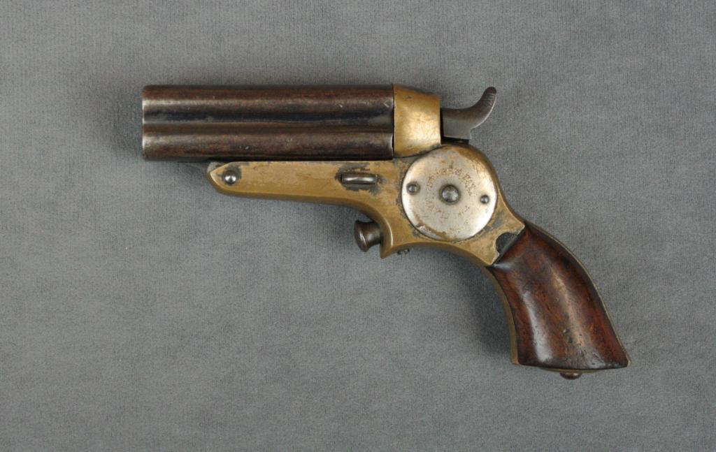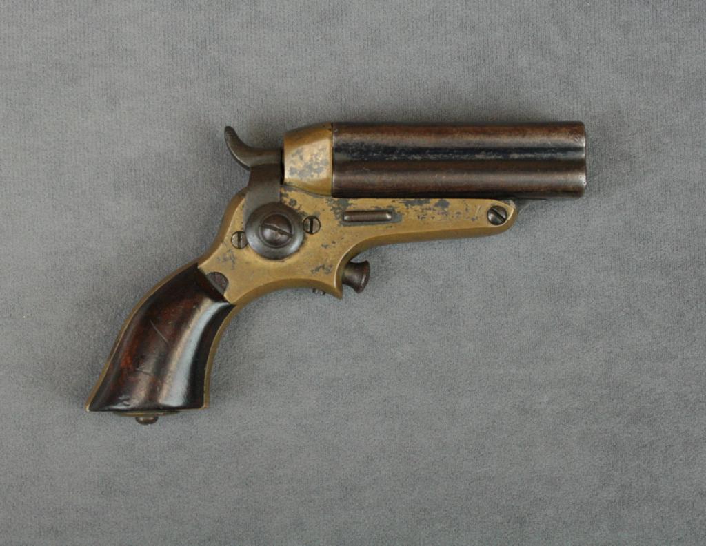 Starr pepperbox four barrel derringer, .32  cal., 2-3/4” barrels, blue finish to barrel  assembly, silver plated brass frame, wood  grips, #NVSN.  This gun is in overall very  good condition showing approx. 25% originalblue on barrels in protected areas with  balance gone to a pleasing brown patina,  traces of silver finish on frame and  considerable original silver finish on side  plate, fair bores, overall good action, verygood grips.  Est.:  $800-$1,600.