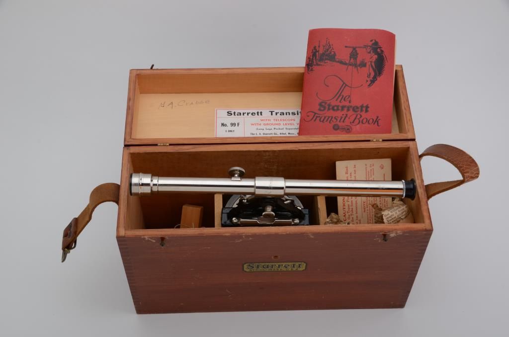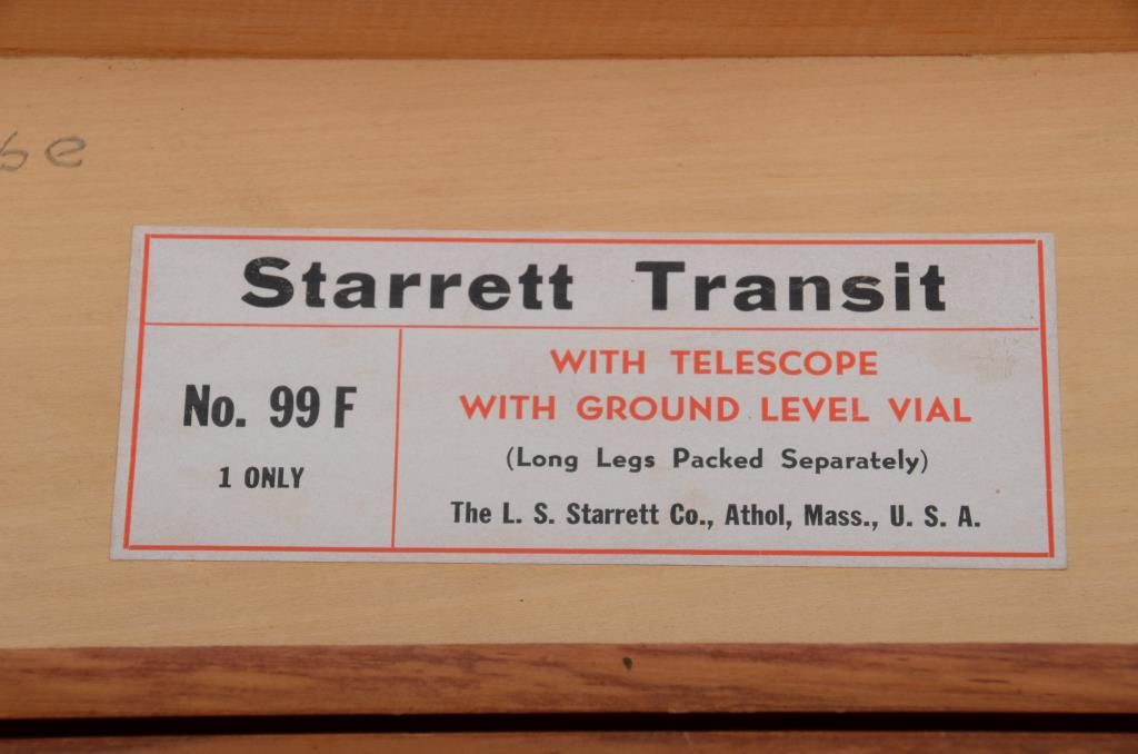 Starrett Surveyor’s Transit in wood carry case with name “G.A. Crabbe” carved on top of lid, nickel finish to 12-1/2” telescope mounted on metal adjustable frame with spirit level; good optics, case in overall goodcondition; accompanied by instructions manual. Est.: $150-$300.