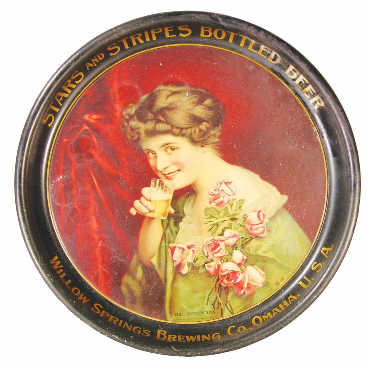 Stars and Stripes Bottled Beer Tin Serving Tray. Willow Springs Brewing Co. Omaha, NB. Some stains and wear otherwise good condition. 13 inch diameter.