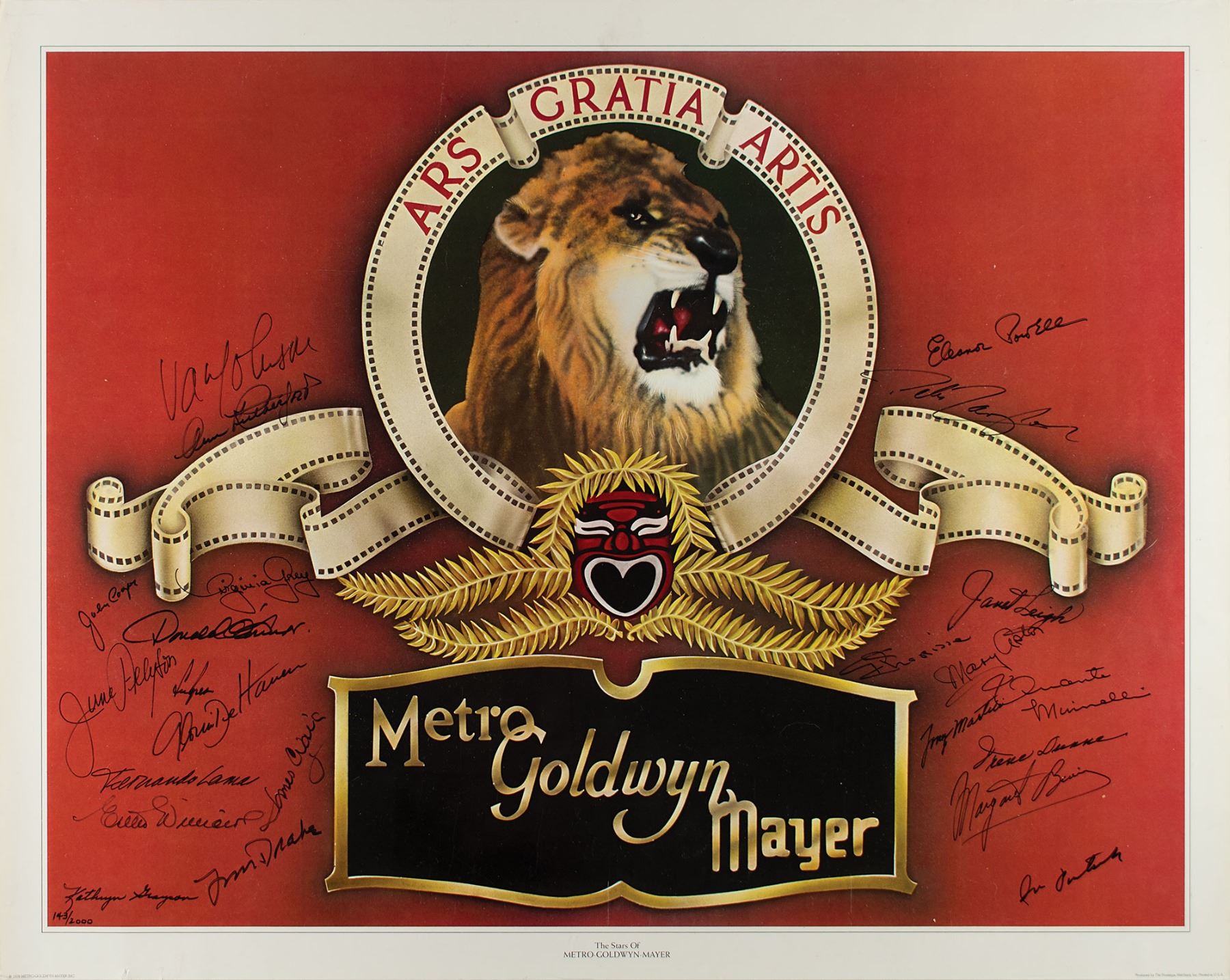 Limited edition color 30 x 24 poster entitled 'The Stars of Metro-Goldwyn-Mayer,' numbered 143/2000, signed in black felt tip by 23 stars: June Allyson, Mary Astor, Lew Ayres, Cyd Charisse, Jackie Cooper, James Craig, Gloria DeHaven, Tom Drake, Irene Dunne, Virginia Grey, Kathryn Grayson, Van Johnson, Fernando Lamas, Peter Lawford, Janet Leigh, Tony Martin, Vicente Minnelli, Margaret O'Brien, Donald O'Connor, Joe Pasternak, Eleanor Powell, Ann Rutherford, and Esther Williams. Rolled and in fine condition, with some small nicks to edges. Accompanied by the publisher's certificate of authenticity.