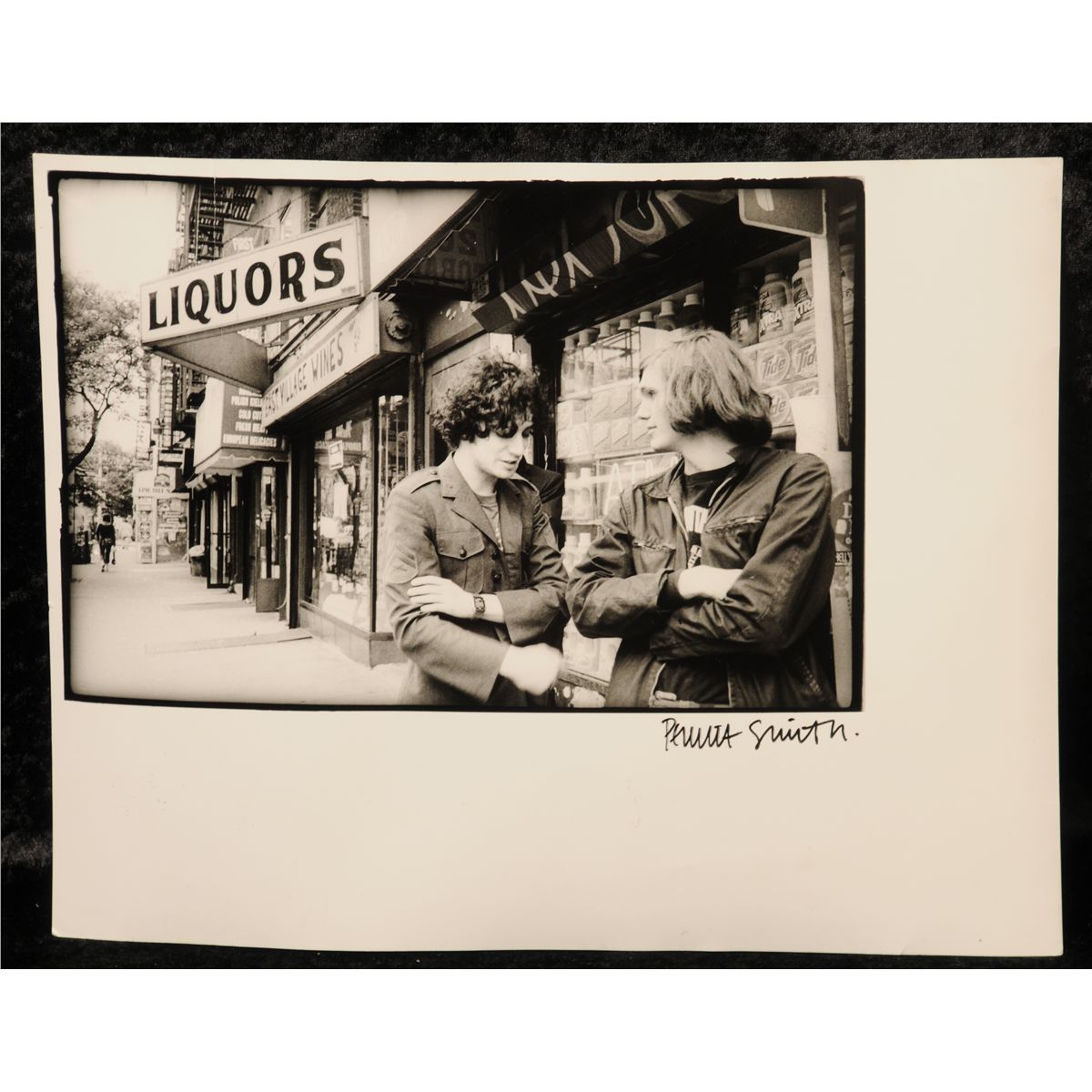 in black marker pen and brio, dedicated, 2003, with a black and white photograph of the The Strokes by Pennie Smith (British, 1949-), test print image of The Strokes outside a liquor store, signed by the photographer Pennie Smith