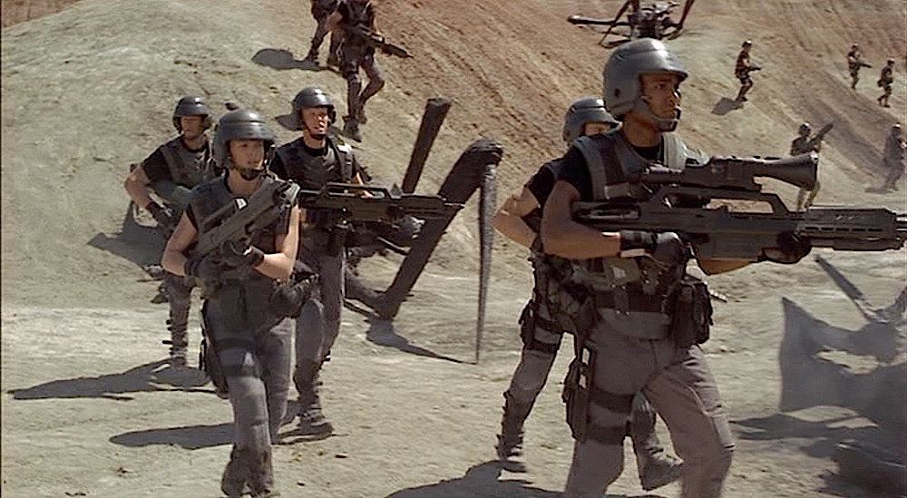 (TriStar Pictures, 1997) This set of hero combat uniform accessories were acquired by the production for use by various actors during filming. These are higher quality pieces for close up shots compared with regular foam or rubber items for the majority of other soldiers. The set consists of a knife belt with Cyalume flares, 2 red and 2 green, a knife cut from solid aluminum, a pair of gloves, a water bottle and pouch with belt clip, a set of two stunt grenades with canvas pouch, a set of two metal and plastic ammo clips from the live firing morita with canvas pouches and a canvas pouch with wrapped food ration. A costume tag is attached to the knife belt that reads "Denise doesn't like this belt. Back-up only!"